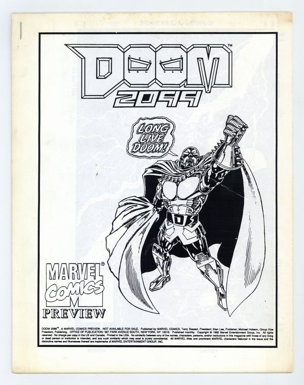 Retailer Preview. Story by John Francis Moore. Art by Pat Broderick. These booklets were sent to retailers to help promote the upcoming series. Uncorrected proof of 22 pages of Doom 2099 (1993 Marvel) #1. Loose pages stapled. 8 1/2" X 11". B&W. 26 pages.