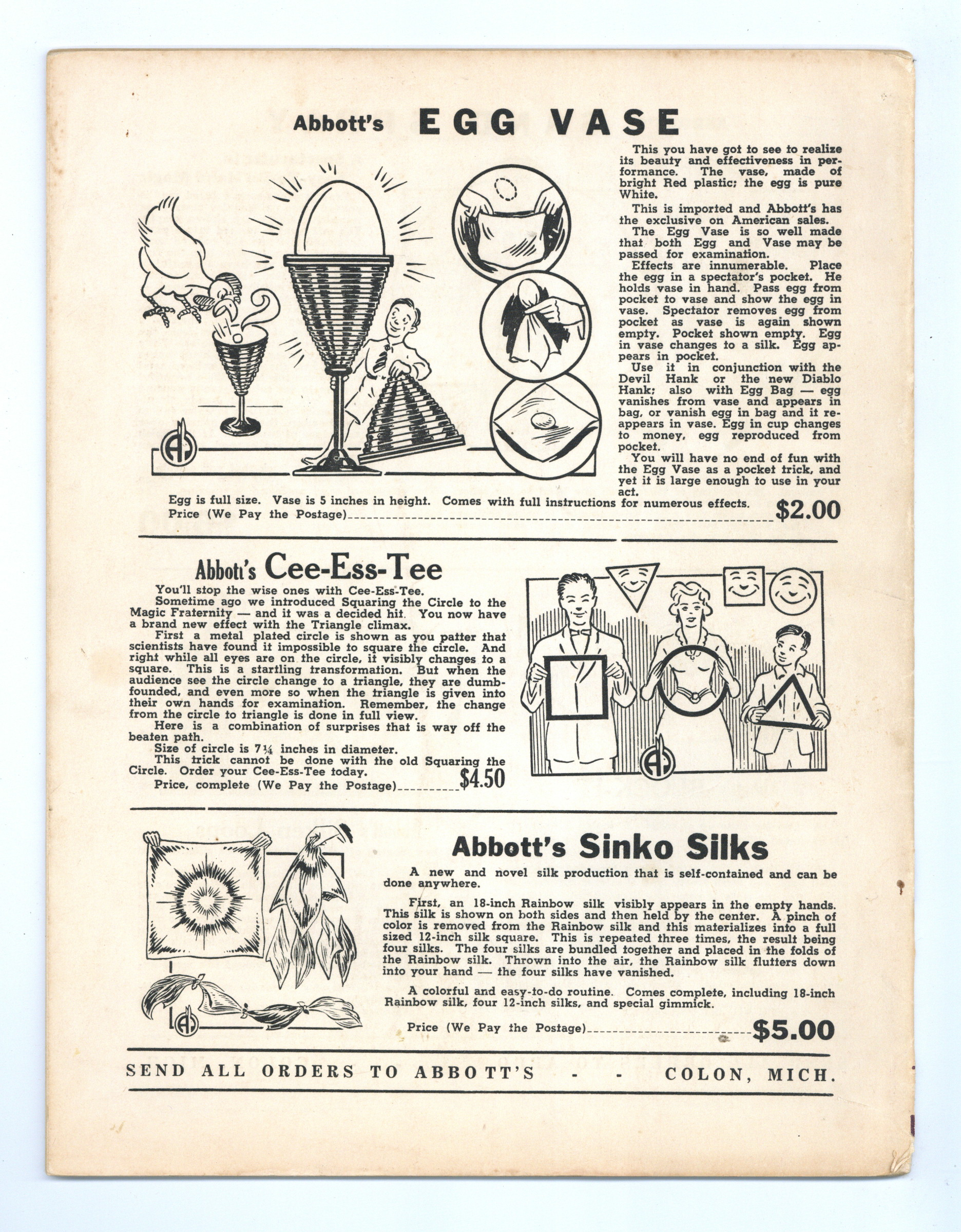 Published Jan 1956 by Abbott Magic & Novelty Co..$9.00- Spine split 15%. Staple rust: Slight.