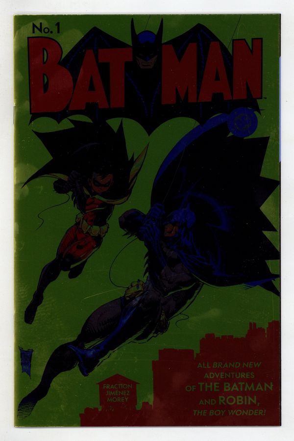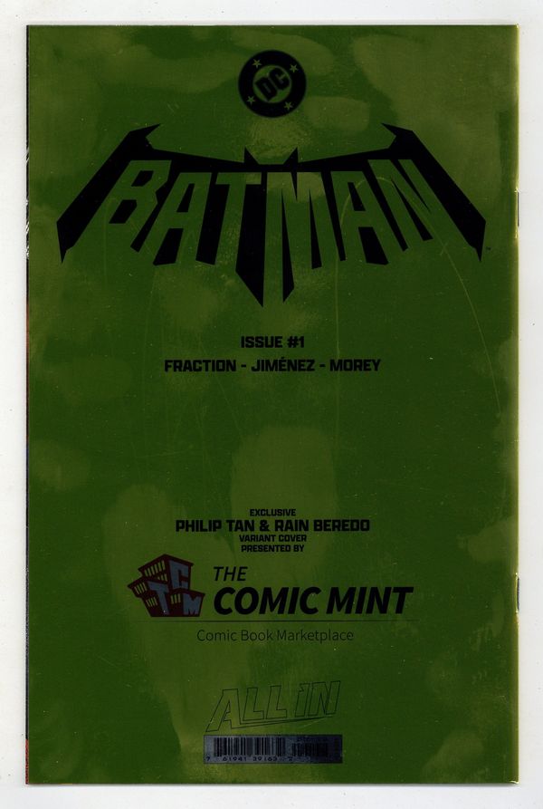 The Comic Mint New York Comic Con Exclusive Foil Cover by Phlip Tan and Rain Beredo - Limited to 800 copies. Written by Matt Fraction. Art by Jorge Jimenez. A BOLD NEW ERA OF BATMAN STARTS HERE! A new day dawns for the Dark Knight Detective as Eisner Award-winning writer Matt Fraction (Hawkeye, Superman's Pal Jimmy Olsen) joins forces with superstar artist Jorge Jimenez (Batman, Summer of Superman Special) for an unforgettable new era of Batman! The best superhero in comics gets a brand-new first issue to kick off this new era that will test Batman and Bruce Wayne like never before! 36 pages, full color. Rated T+ Cover price $4.99.