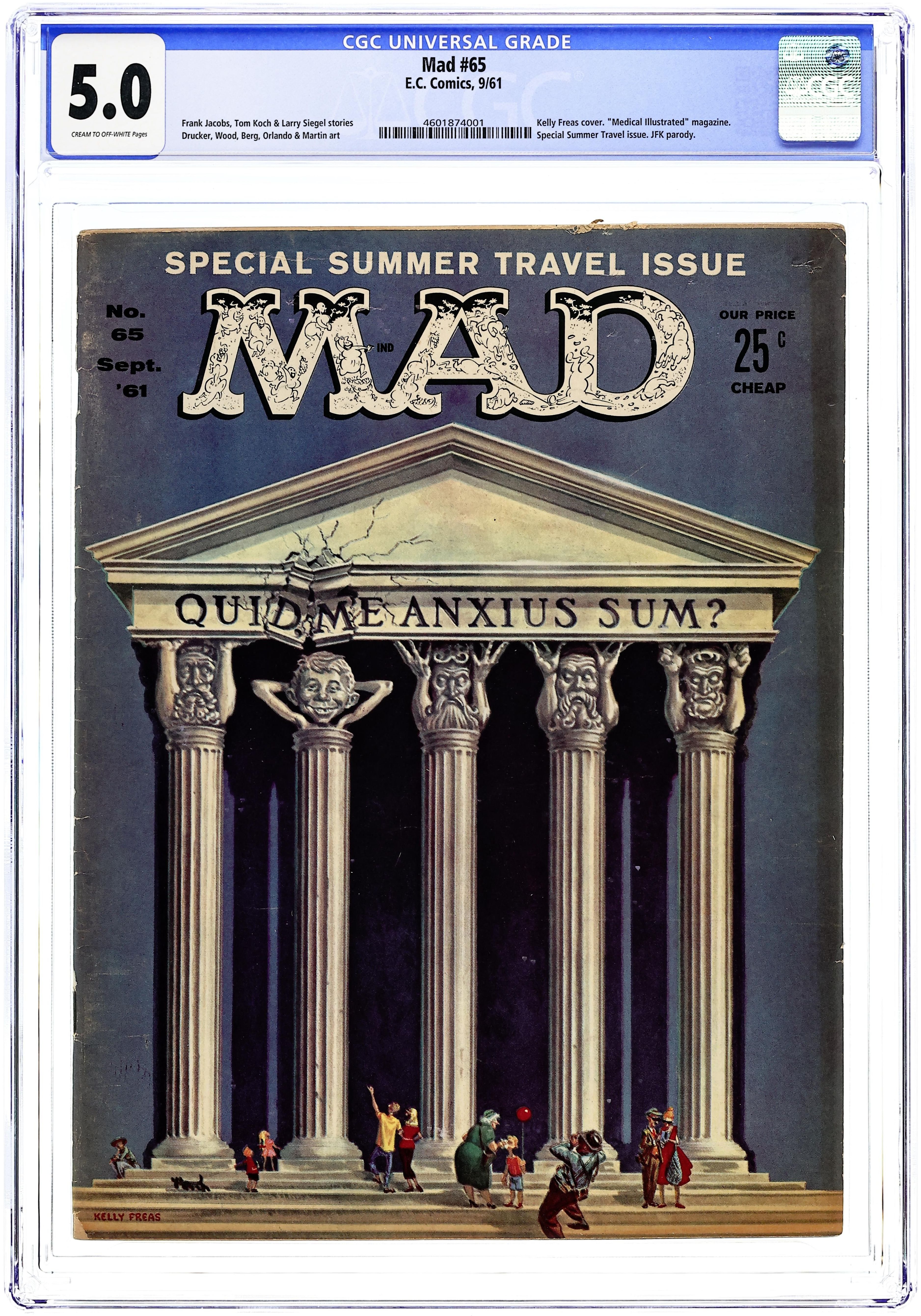 Cover art by Kelly Freas. "A Realistic Children's Book For Realistic Children," script by Gary Belkin and Pearl Belkin, art by Joe Orlando. "The Inventor," script and art by Don Martin. "How Madison Avenue Could Sell America to the World," art by Bob Clarke; Altering famous advertising campaigns so the product they sell is the United States. "Spy Vs. Spy," script and art by Antonio Prohias; The Black Spy uses a sonic attack against the White Spy. "Television Programs Aimed at Late, Late Audiences," script by Frank Jacobs, art by Wally Wood; Television programs targeted to specific demographics known to be up overnight. "A Mad Look at the Beach," script and art by Dave Berg. "A Mad Guide to Classified Ad Abbreviations," script by Tom Koch, art by George Woodbridge; Satirical classified ad abbreviations. "Mad's Custom Career-Designed European Tours," script by Don Reilly, art by Jack Rickard. "TV Commercials With Suspense," script by Tom Koch, art by Bob Clarke; Altering familiar television commercials to create suspenseful endings. "Medical Illustrated," script by Larry Siegel, art by George Woodbridge; Satirical version of a magazine geared toward physicians. "Mad's Auto Travel Games," script by Tom Koch, art by Joe Orlando; Games that can occupy children during long car trips. "Karate," script by Jack Mendelsohn, art by Bob Clarke; Satirical look at the martial art of karate. "The Good Doctor in Africa," script and art by Don Martin; An African explorer gets a surprise. "The Jack Kennedy Show," script by Gary Belkin, art by Mort Drucker; What if President John Kennedy hosted a television talk show like NBC's The Tonight Show? Parody of Cadillac print ads, art by Kelly Freas. 52 pgs., B&W. Cover price $0.25.