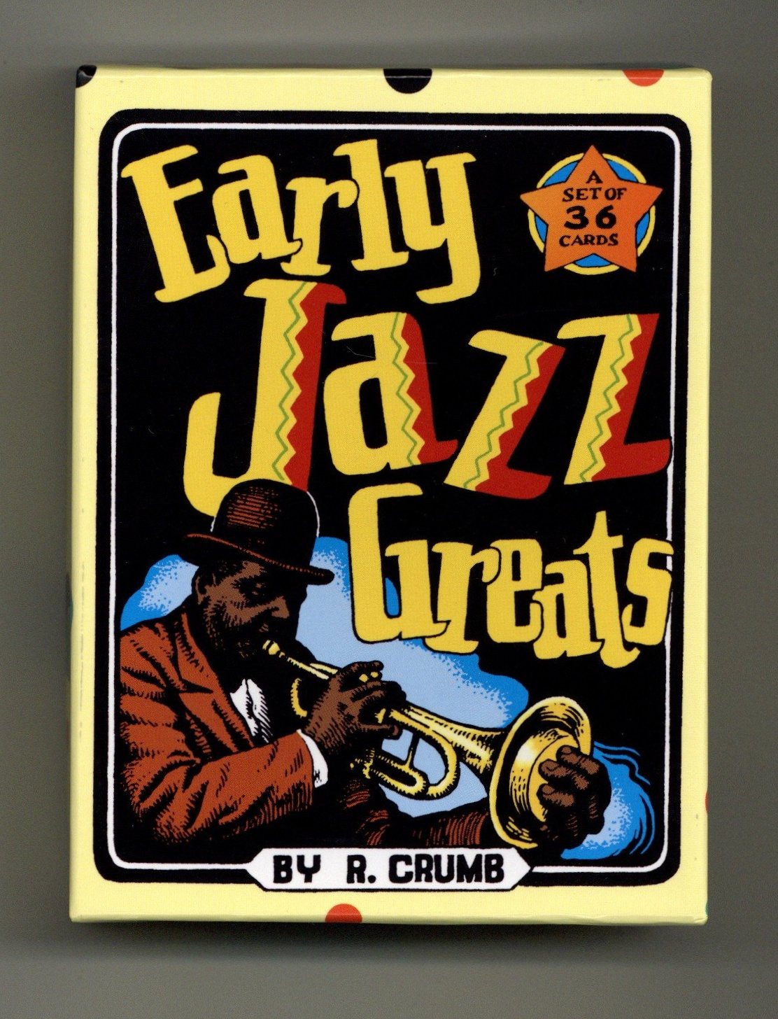 2nd printing. Set of 36 cards featuring "Early Jazz Greats" illustrated by R. Crumb. 3" x 4", Box of 36 color illustrated trading cards.