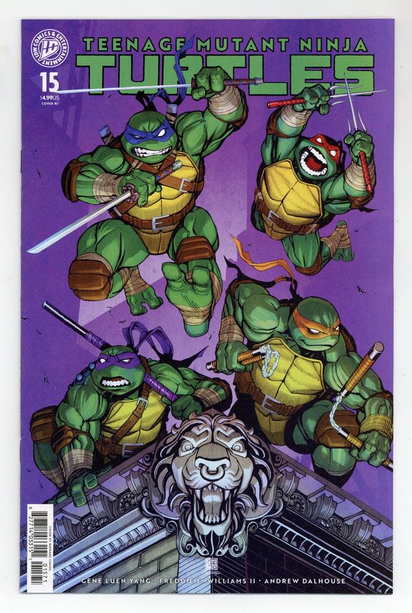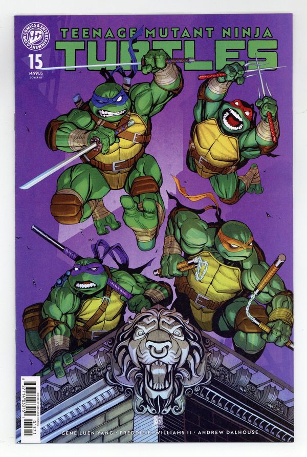 Published by IDW Publishing.$30.00Limited 1 for 75 Retailer Incentive Variant Cover. (W) Gene Luen Yang (A) Freddie E. Williams II (CA) Bernard Chang Father and sons, together again! The Turtles are overjoyed to have Splinter back with them, but there are dark things lurking in the shadows—a mysterious new magic-wielding foe disrupts the family reunion! The Turtles also learn who Ujigami’s next target is, and the race is on to save one of their greatest allies! Cover price $4.99.