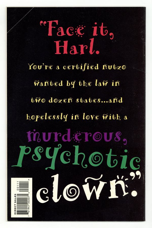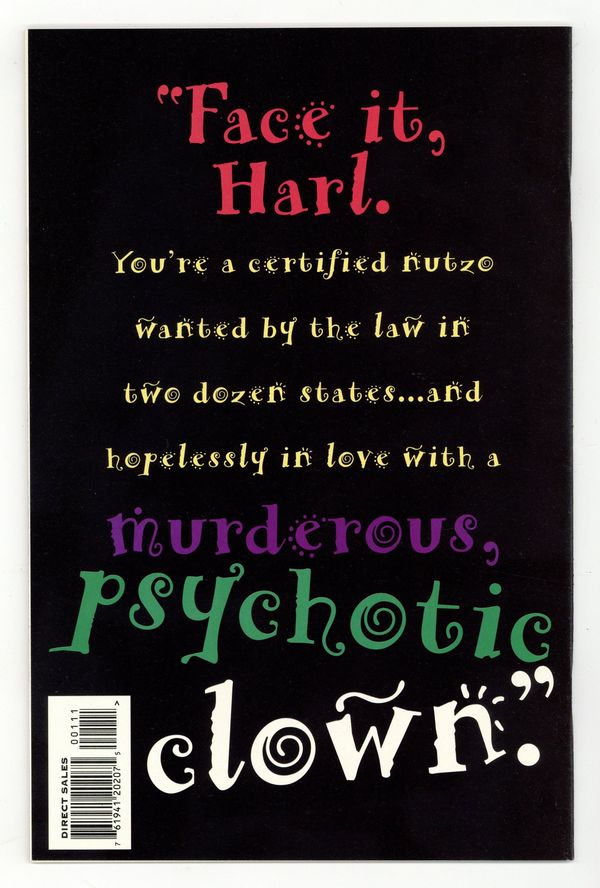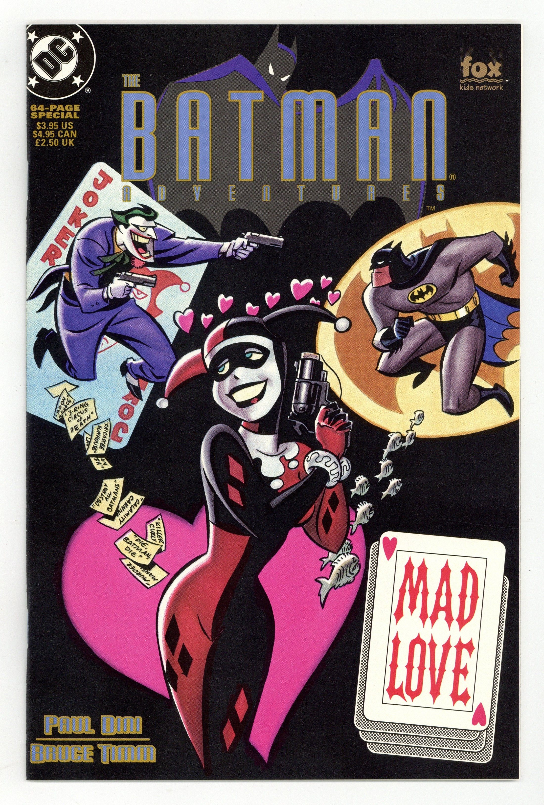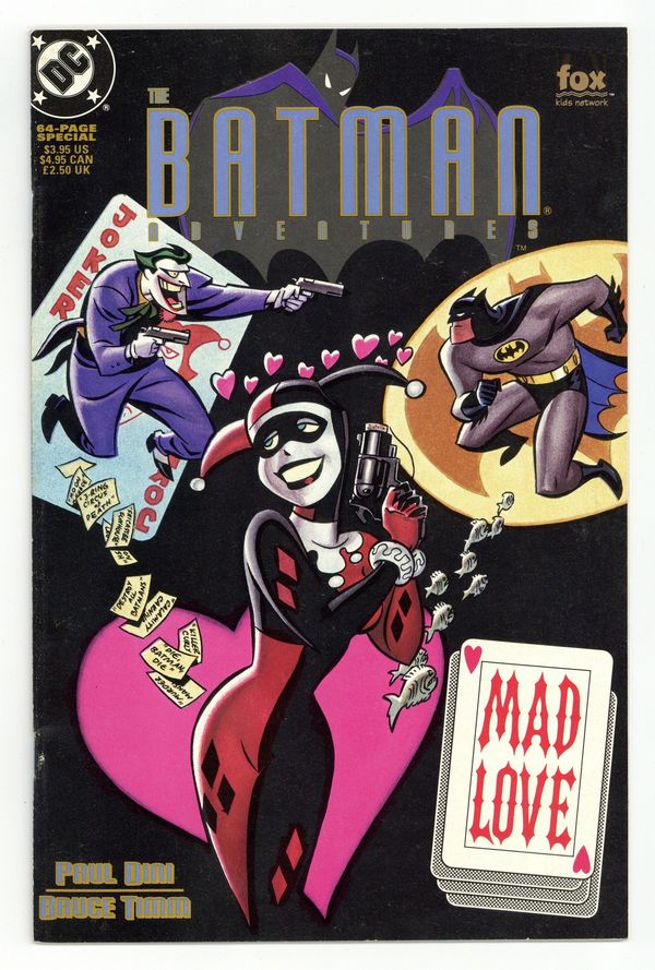 First Printing. Direct Edition. Story by Paul Dini, art by Bruce Timm. Featuring the origin of the Joker's girlfriend, Harley Quinn. This is the 1st Printing, which has a black cover and a playing card in the lower right corner with "Mad Love" in red letters. Cover price $3.95.