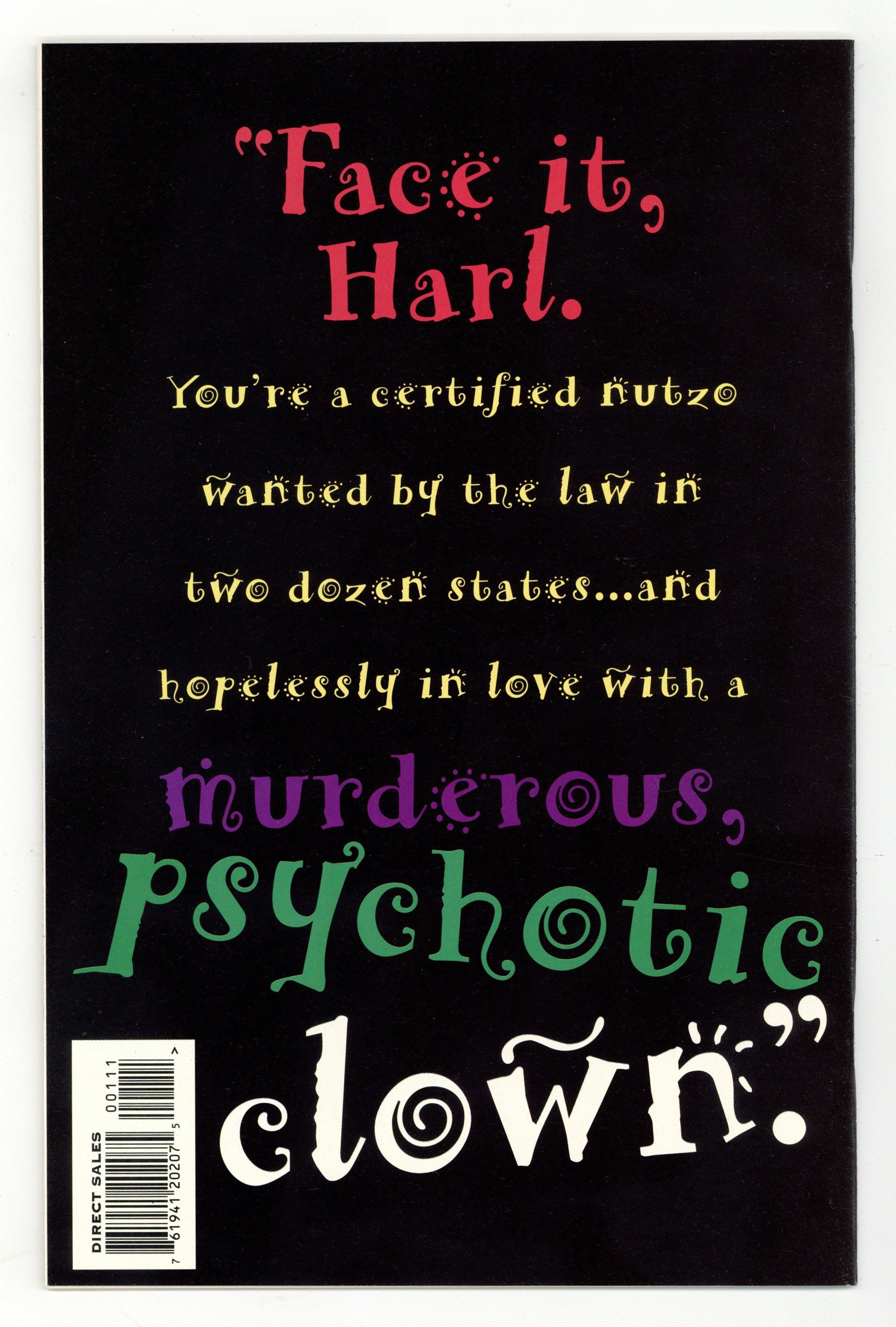 Tags: Batman$85.00First Printing. Direct Edition. Story by Paul Dini, art by Bruce Timm. Featuring the origin of the Joker's girlfriend, Harley Quinn. This is the 1st Printing, which has a black cover and a playing card in the lower right corner with "Mad Love" in red letters. Cover price $3.95.