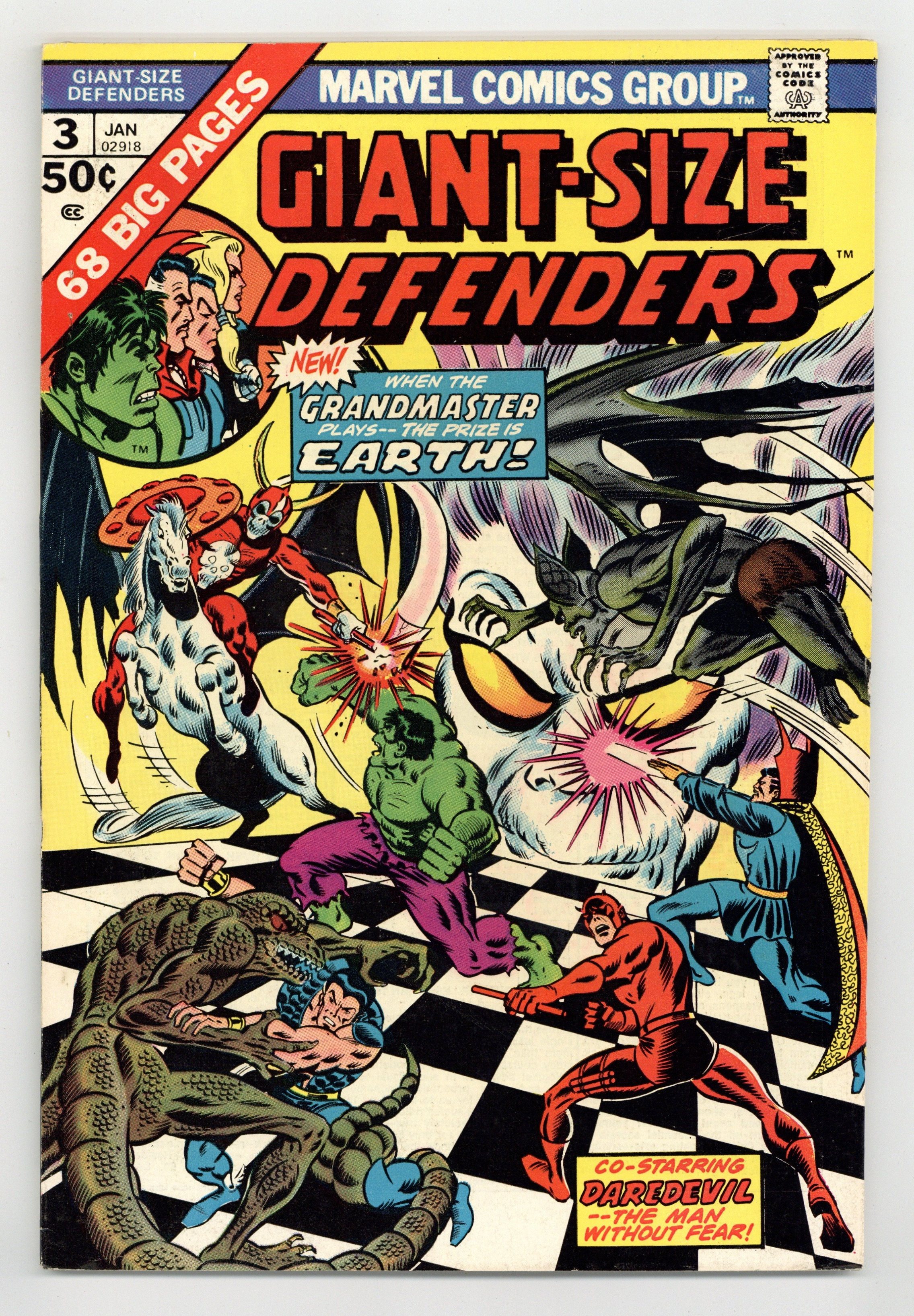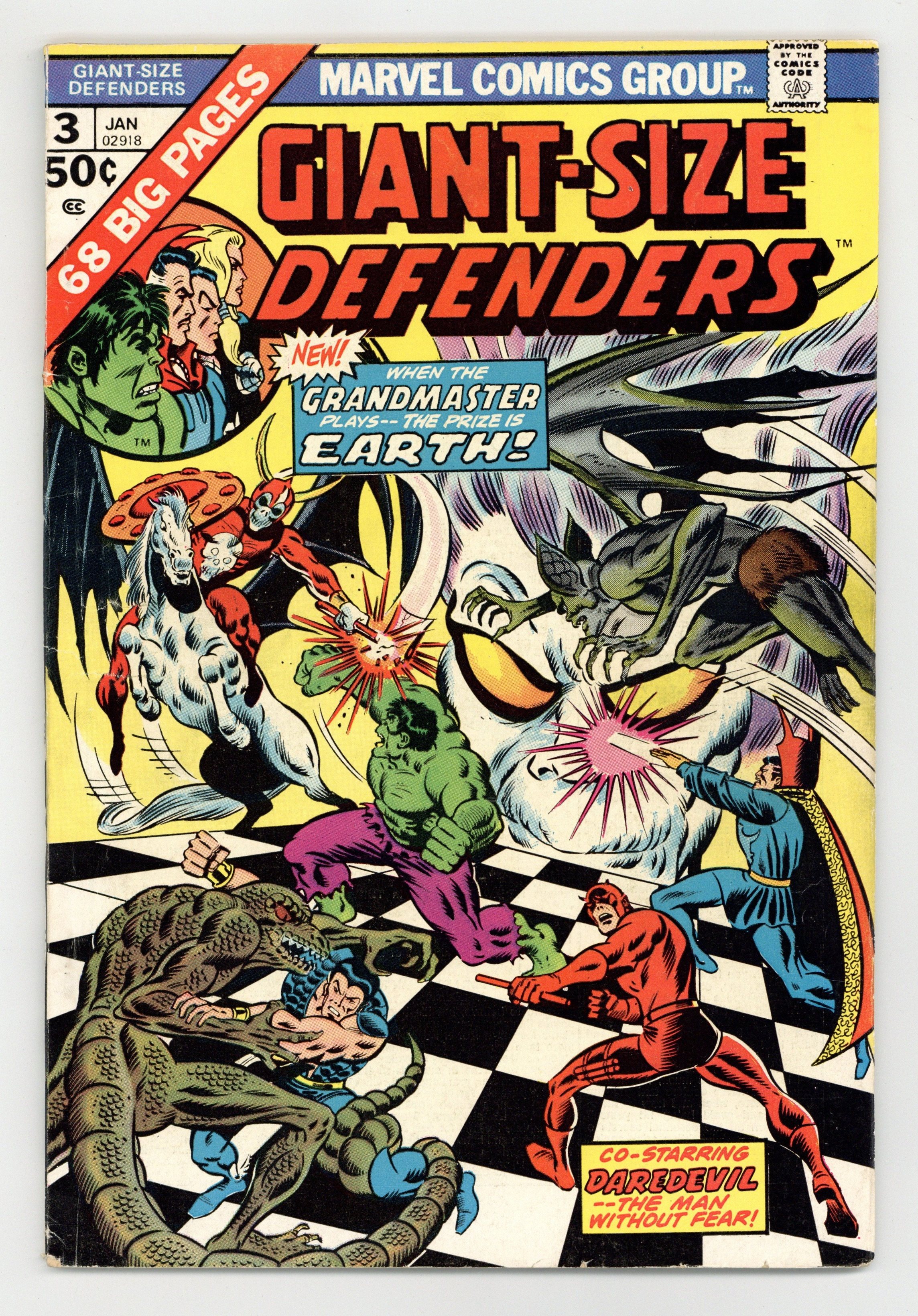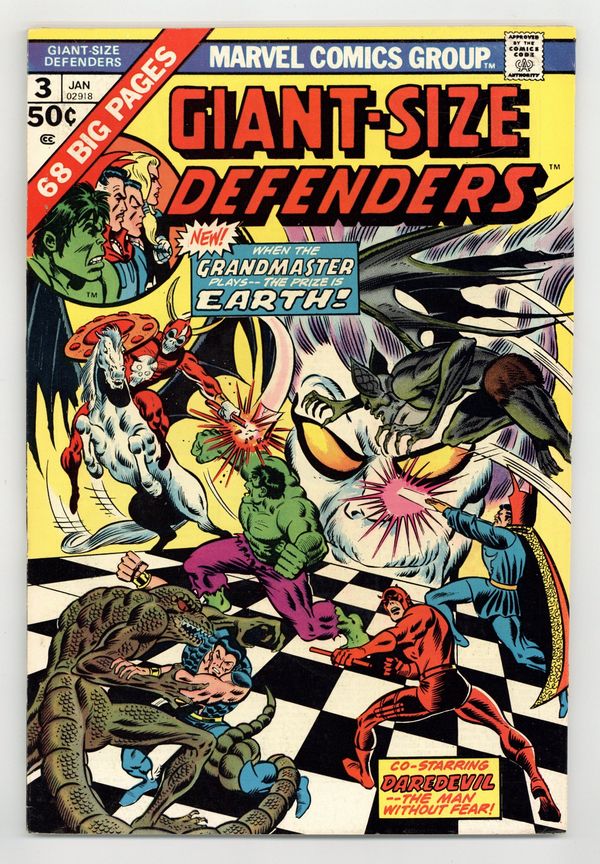 Cover pencils by Ron Wilson, inks by Joe Sinnott. New story: 1st appearance of Korvac in "Games Godlings Play!", script by Steve Gerber (script, plot), Jim Starlin (plot), and Len Wein (plot), pencils by Jim Starlin (layouts), Dan Adkins (finished art), Don Newton (finished art), and Jim Mooney (finished art), inks by Dan Adkins (pages 1-7, 10-11, 22-27, 43), Don Newton (pages 14-19, 31-36, 38), and Jim Mooney (pages 8-9, 30, 37, 39, 44); The Grandmaster and the Prime Mover play a game for the fate of the Earth; The Grandmaster selects the Defenders for his "pieces" and the Prime Mover selects several alien "pieces" and combat begins. "The World Destroyers!" starring the Sub-Mariner, script and art by Bill Everett. "The House of Shadows!", script by Stan Lee, art by Steve Ditko; Doctor Strange is on the scene to observe a TV crew as they prepare to enter & broadcast about a "Haunted House." Letter from Mary Jo Duffy. 68 pgs., full color. $0.50. Cover price $0.50.