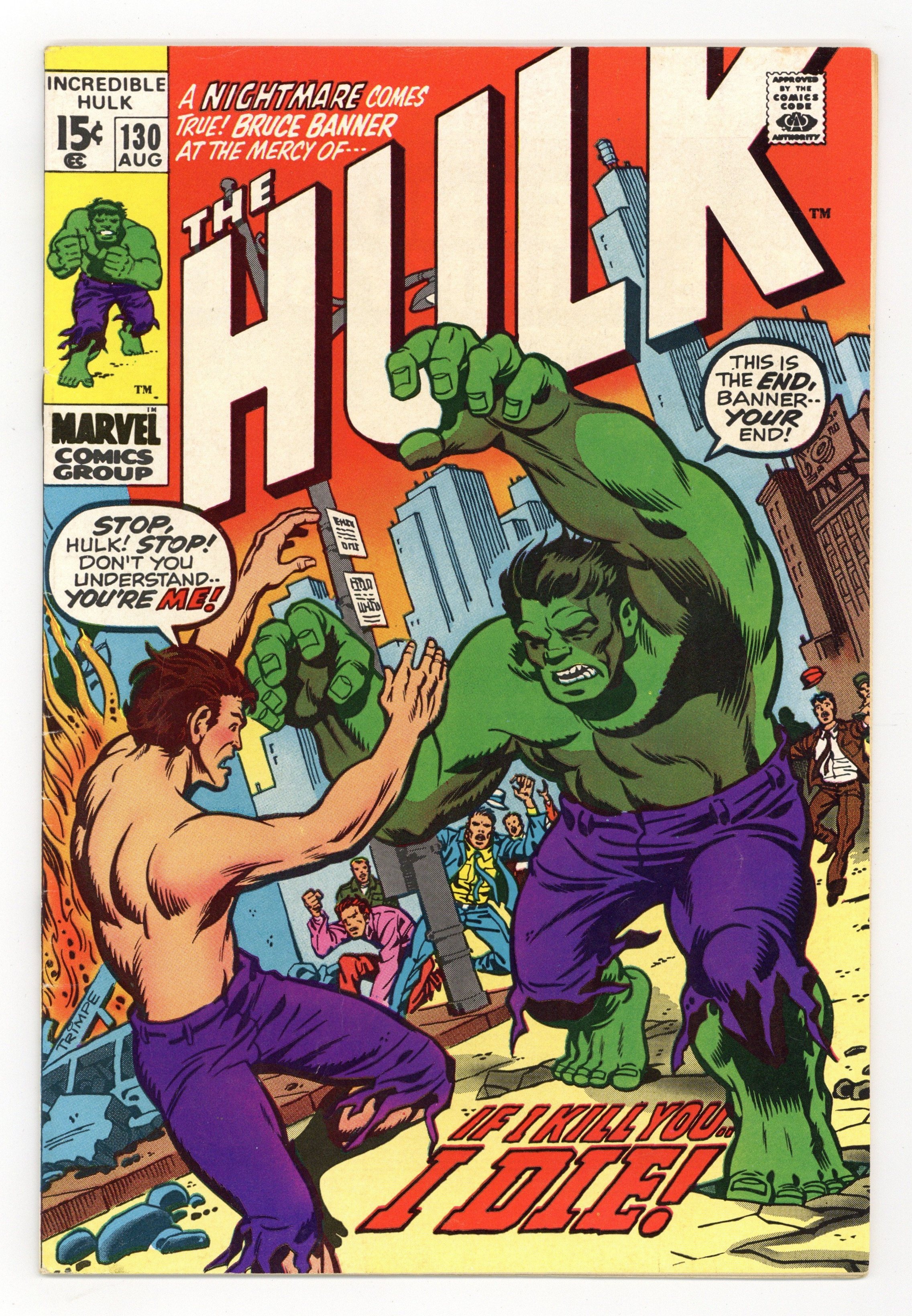 Tags: Marvel Legacy Numbering: Hulk (part 130), Hulk$24.00Cover art by Herb Trimpe. If I Kill You, I Die!, script by Roy Thomas, art by Herb Trimpe; Bruce Banner reunites with an old classmate in gamma studies and the two cobble together a machine to end the menace of the Hulk; When Raoul uses the gammatron, it separates Bruce and the Hulk into two individual beings; Banner runs to Ross with the Hulk in hot pursuit and he decides that the only way to contain him is to merge once again with the jade giant. Continued from Captain Marvel #21. 36 pgs. $0.15. Cover price $0.15.