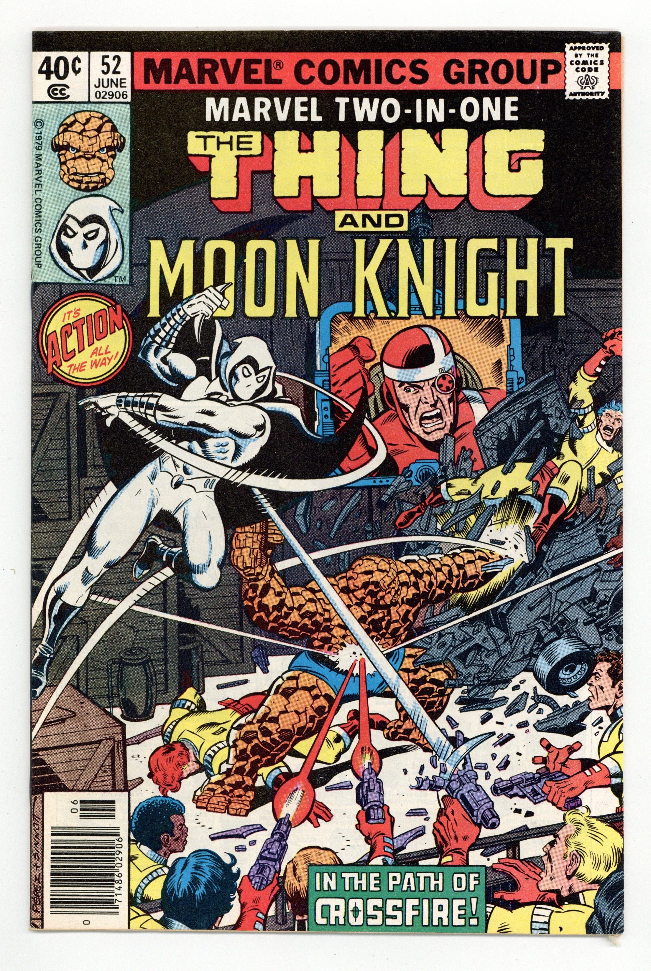 Cover by George Pérez and Joe Sinnott. "In the Path of Crossfire!" Guest-starring Moon Knight. Story by Steve Grant. Art by Jim Craig and Pablo Marcos. The Thing meets the mysterious Moon Knight and they must find a way to work together if they're going to take down the nefarious Crossfire. Cover price $0.40.