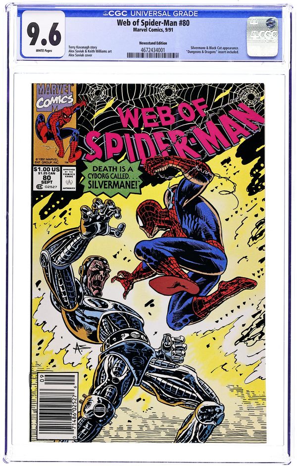Newsstand Edition. "This Blood is My Blood" Part 2 of 2. Script by Terry Kavanagh. Pencils by Alex Saviuk. Inks by Keith Williams. Cover by Alex Saviuk. Mary Jane is worried sick about her husband, after the web-slinger disappeared while battling the Ripster last issue! In an act of sheer desperation, she turns to an unlikely source for help…Felicia Hardy! Wow, can the Black Cat find the amazing one? Hopefully she can before Silvermane finishes draining all of Spider-Man's blood! It's a grisly battle down below as Spider-Man and the Black Cat team up to short-circuit Silvermane! 32 pages Cover price $1.00.