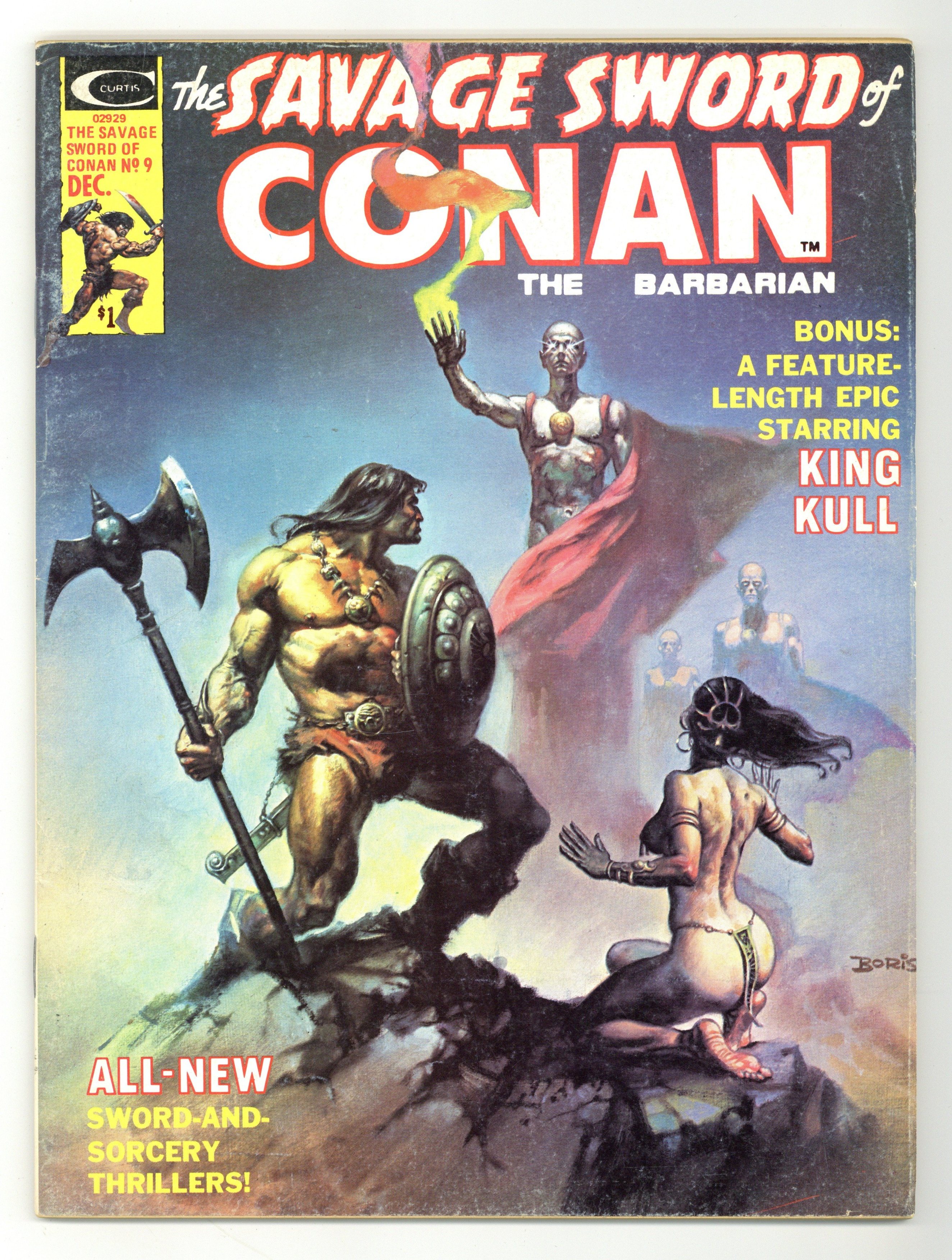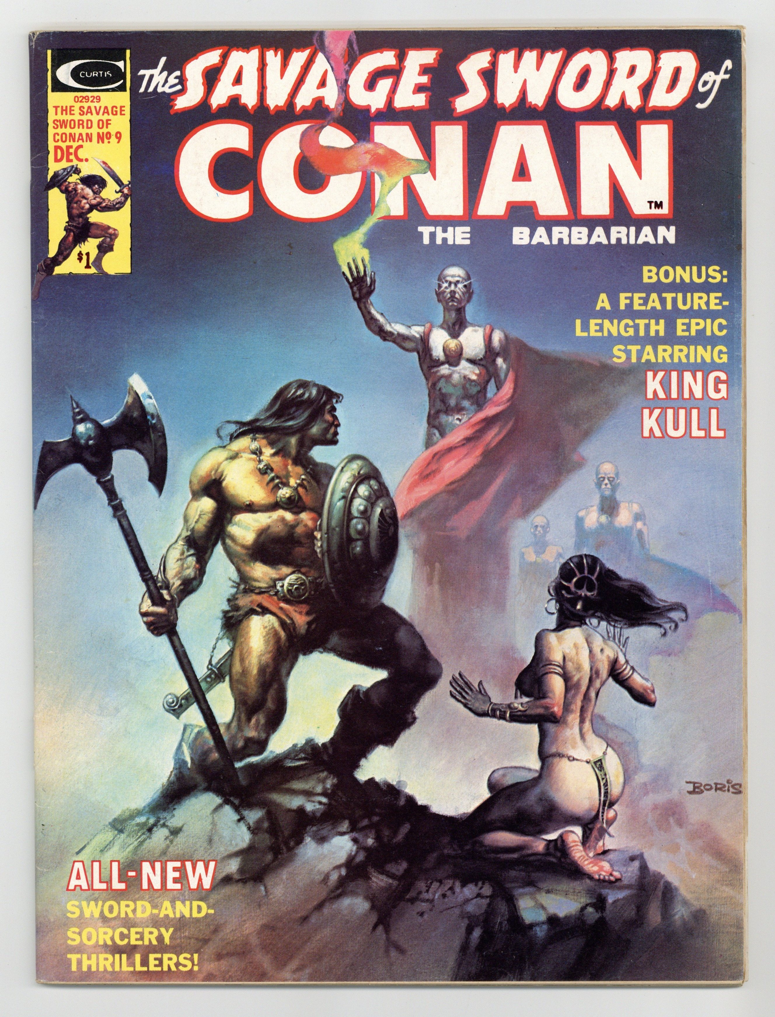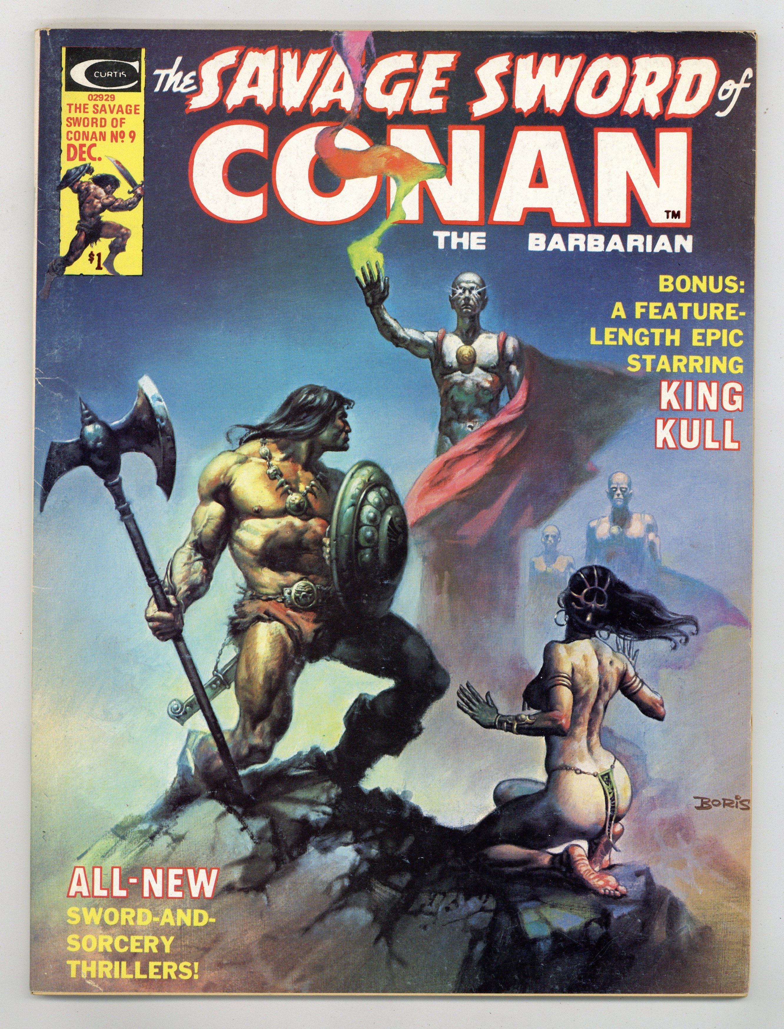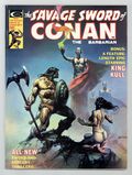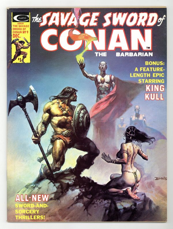 $18.75Conan stars in "The Curse of the Cat-Goddess." Script by Roy Thomas, art by Pablo Marcos. King Kull stars in "When a Tiger Returns to Atlantis." Script by Doug Moench, art by Sonny Trinidad. Story continued from Kull and the Barbarians 3. The Gods of the Hyborian Age (part 4): "Demi-Gods and Demons." Article by Robert L. Yaple with illustrations by Pablo Marcos and J. Steinle. 2-page Hyborian Age map by Tim Conrad. 6-page Conan portfolio by Steve Fabian. in "The Conjurer From Cross Plains," Fred Blosser reviews "The Miscast Barbarian" by L. Sprague de Camp. Art by Fabian and Roy Krenkel. John Byrne illustration of Conan for the "Next Issue" ad page. Conrad frontispiece. Boris Vallejo cover. Cover price $1.00.