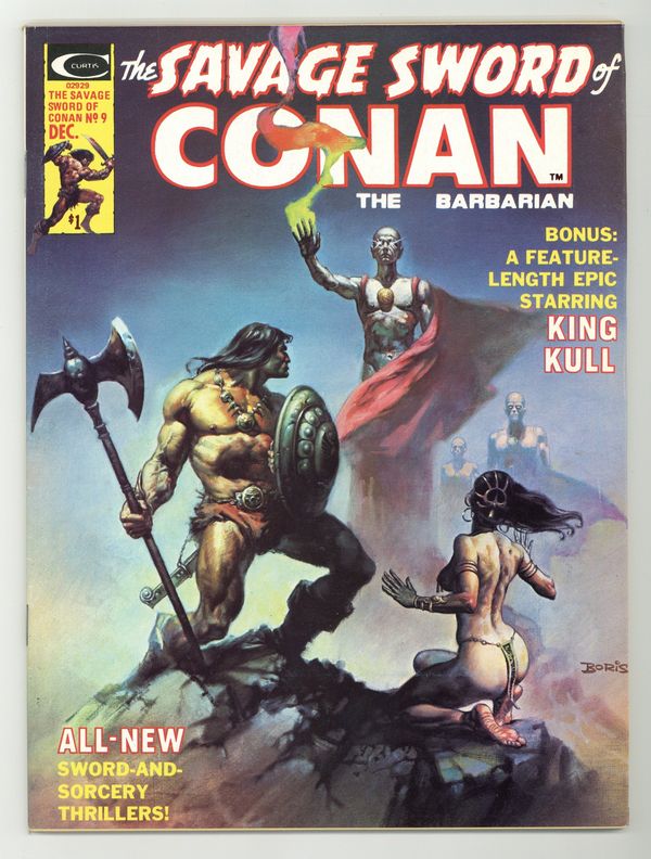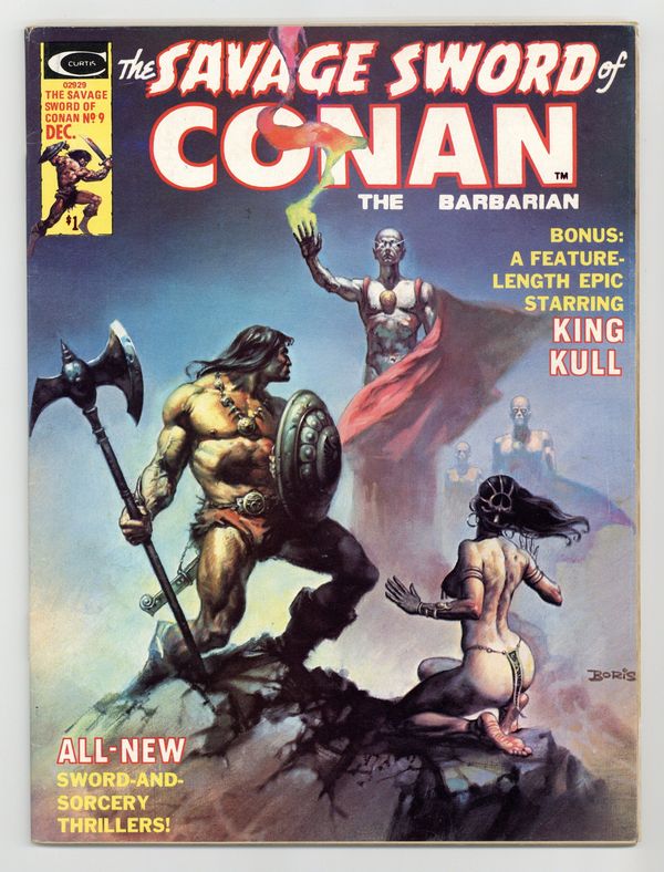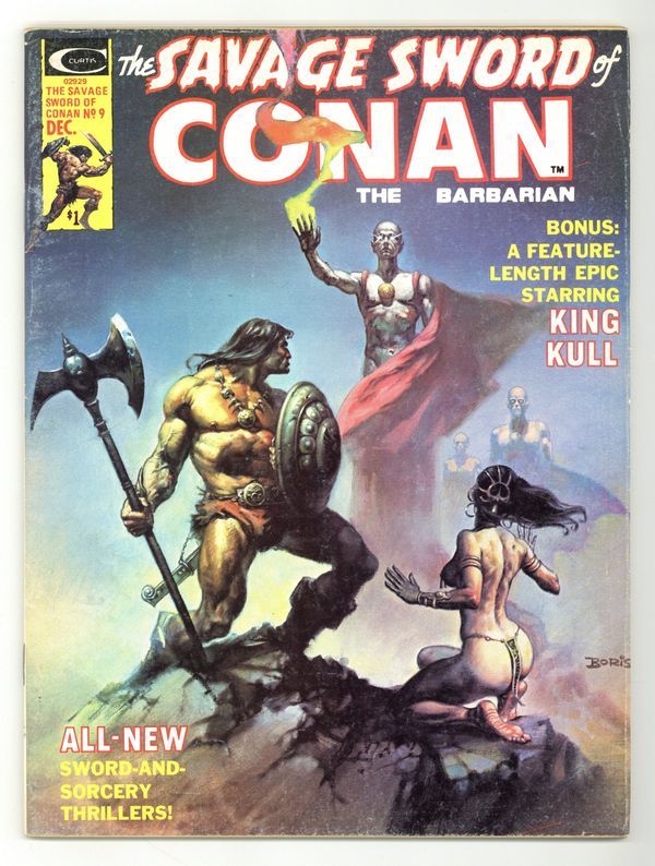 $23.50Conan stars in "The Curse of the Cat-Goddess." Script by Roy Thomas, art by Pablo Marcos. King Kull stars in "When a Tiger Returns to Atlantis." Script by Doug Moench, art by Sonny Trinidad. Story continued from Kull and the Barbarians 3. The Gods of the Hyborian Age (part 4): "Demi-Gods and Demons." Article by Robert L. Yaple with illustrations by Pablo Marcos and J. Steinle. 2-page Hyborian Age map by Tim Conrad. 6-page Conan portfolio by Steve Fabian. in "The Conjurer From Cross Plains," Fred Blosser reviews "The Miscast Barbarian" by L. Sprague de Camp. Art by Fabian and Roy Krenkel. John Byrne illustration of Conan for the "Next Issue" ad page. Conrad frontispiece. Boris Vallejo cover. Cover price $1.00.