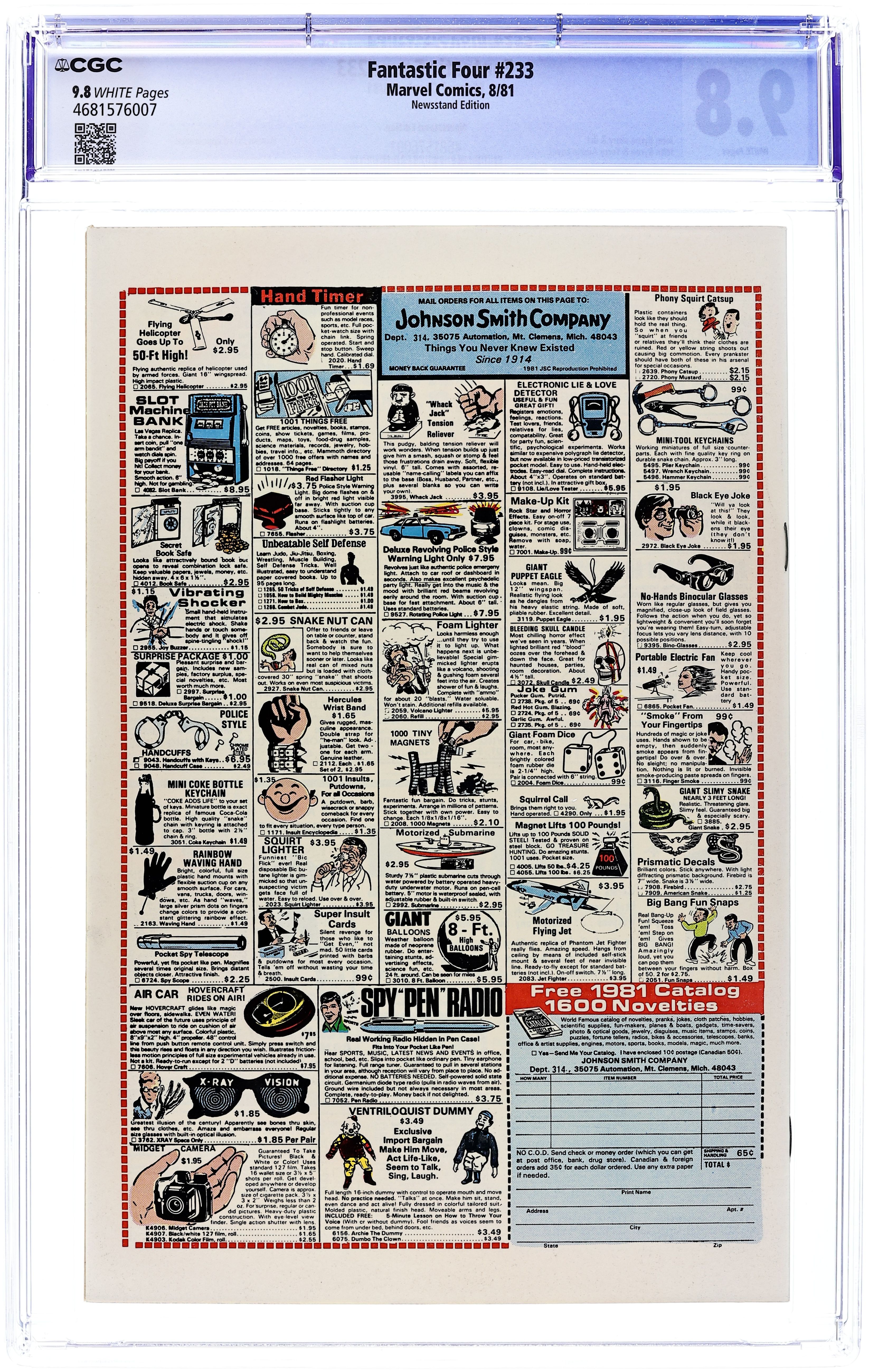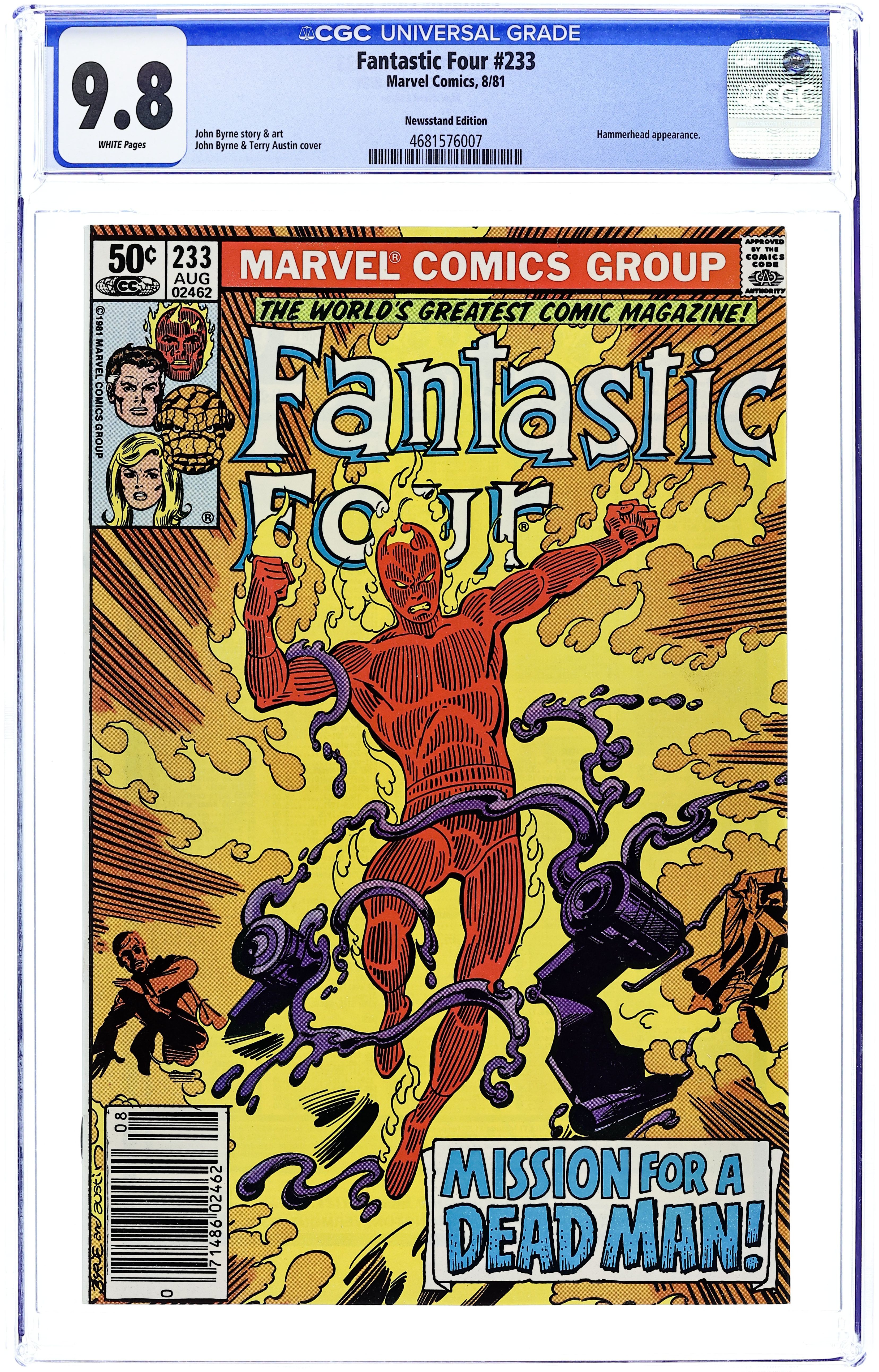 Newsstand Edition. "Mission for a Dead Man!" Script and Art by John Byrne. Cover by John Byrne and Terry Austin. A prisoner on death row makes one final request in the moments before his execution...could his former high school classmate, the Human Torch, clear his name (posthumously)? Johnny Storm picks up the pieces of a years old murder investigation and follows the trail to the Maggia and Hammerhead! Can the Torch beat the web-slinger's old foe? And perhaps clear a dead man's name? 36 pages Cover price $0.50.