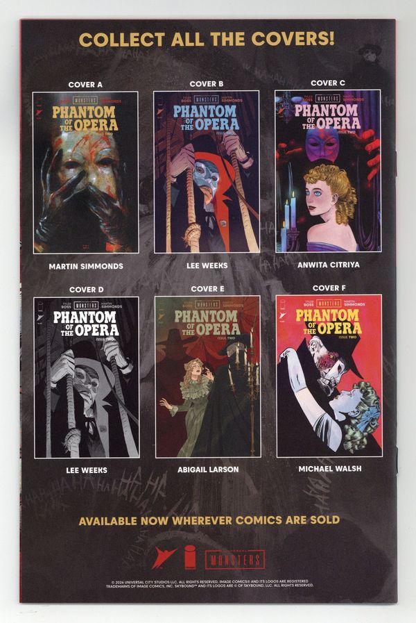 $40.00Limited 1 for 75 Retailer Incentive Variant Cover. (W) Tyler Boss (A) Martin Simmonds (CA) Michael Walsh THE MUST-READ HORROR SERIES OF THE YEAR CONTINUES Christines world has never been brighter...but when The Phantom of The Opera strikes again, nothing will ever be the same. 32 pages, rated T+, full color Cover price $4.99.