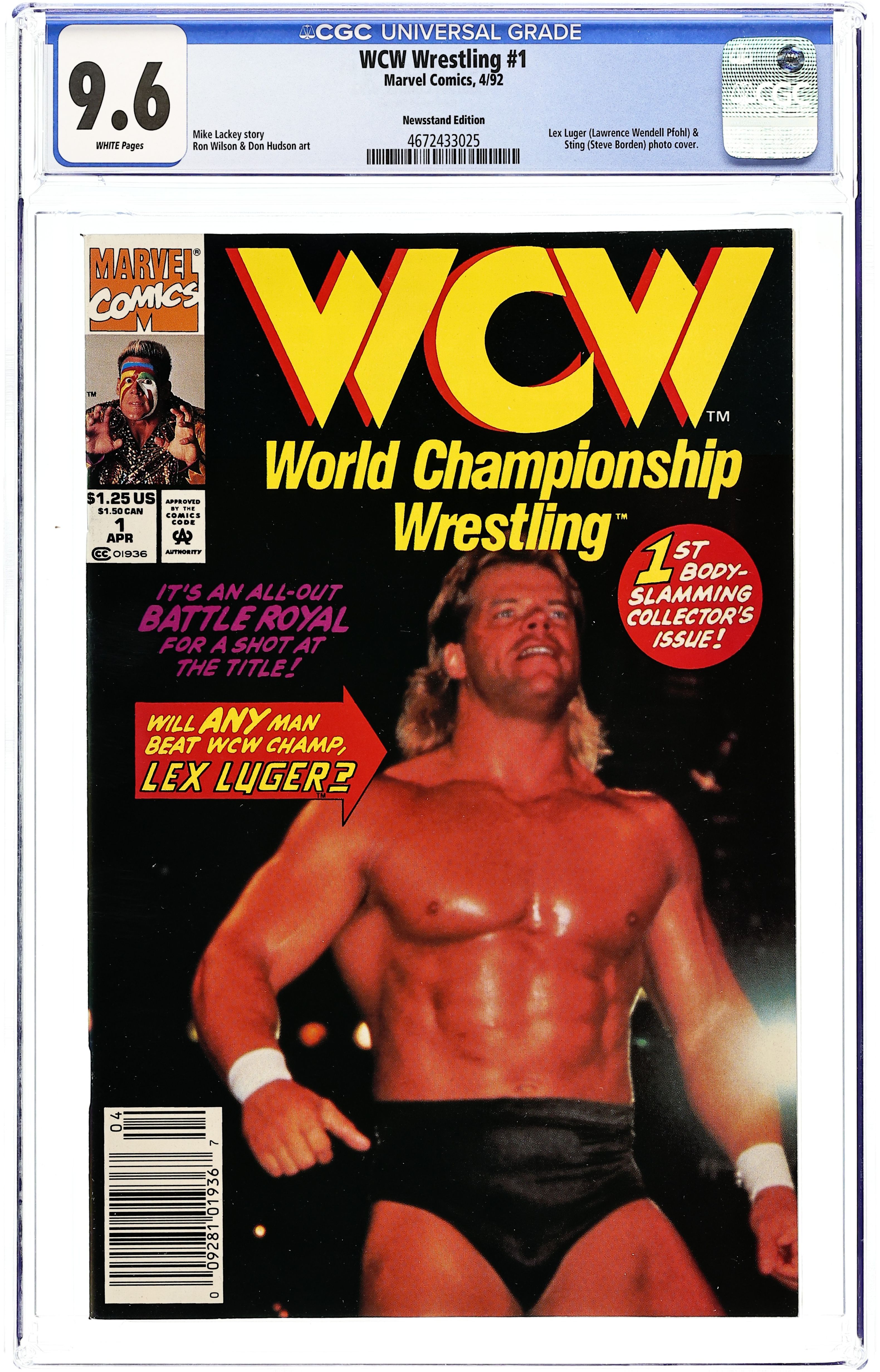 Newsstand Edition. It's an all-out "Battle Royal" for a shot at the title! Real life wrestling heroes and villains like Lex Luger, Sting and El Gigante come to Marvel in this new ongoing series. Written by (Marauder) Mike Lackey, with art by (Rampaging) Ron Wilson and (Dynamic) Don Hudson. Cover price $1.25.