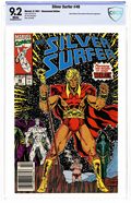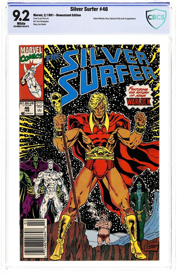 Newsstand Edition. Infinity Gauntlet: Prelude - "...The Soul World!" Featuring the return of Adam Warlock. Guest-starring Drax the Destroyer. Story by Jim Starlin. Art by Ron Lim and Tom Christopher. Utterly defeated by Thanos, the Silver Surfer and Drax the Destroyer awaken in the mysterious Soul World. While, Drax is kept busy by Gamora, the most dangerous woman in the universe, Norrin Radd seeks the council of the master of this realm...the enigmatic Adam Warlock. Cover price $1.00.