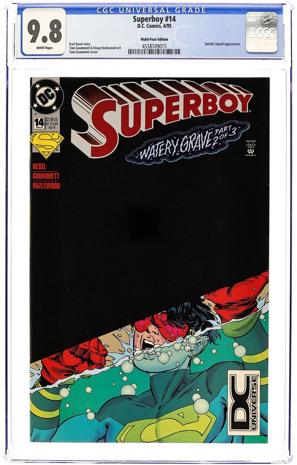 DC Universe Multi-Pack Edition. Watery Grave: Part 2 of 3. "Kill Them All!" Guest-starring Suicide Squad. Story by Karl Kesel. Art by Tom Grummett, Doug Hazlewood, and Stan Woch. When Superboy and the Suicide Squad storm the secret headquarters of the criminal organization known as Dragon, they soon realize one of their own may be as traitor. Can the Boy of Steel and his super-villain cohorts survive this well laid death trap. Cover price $1.50.