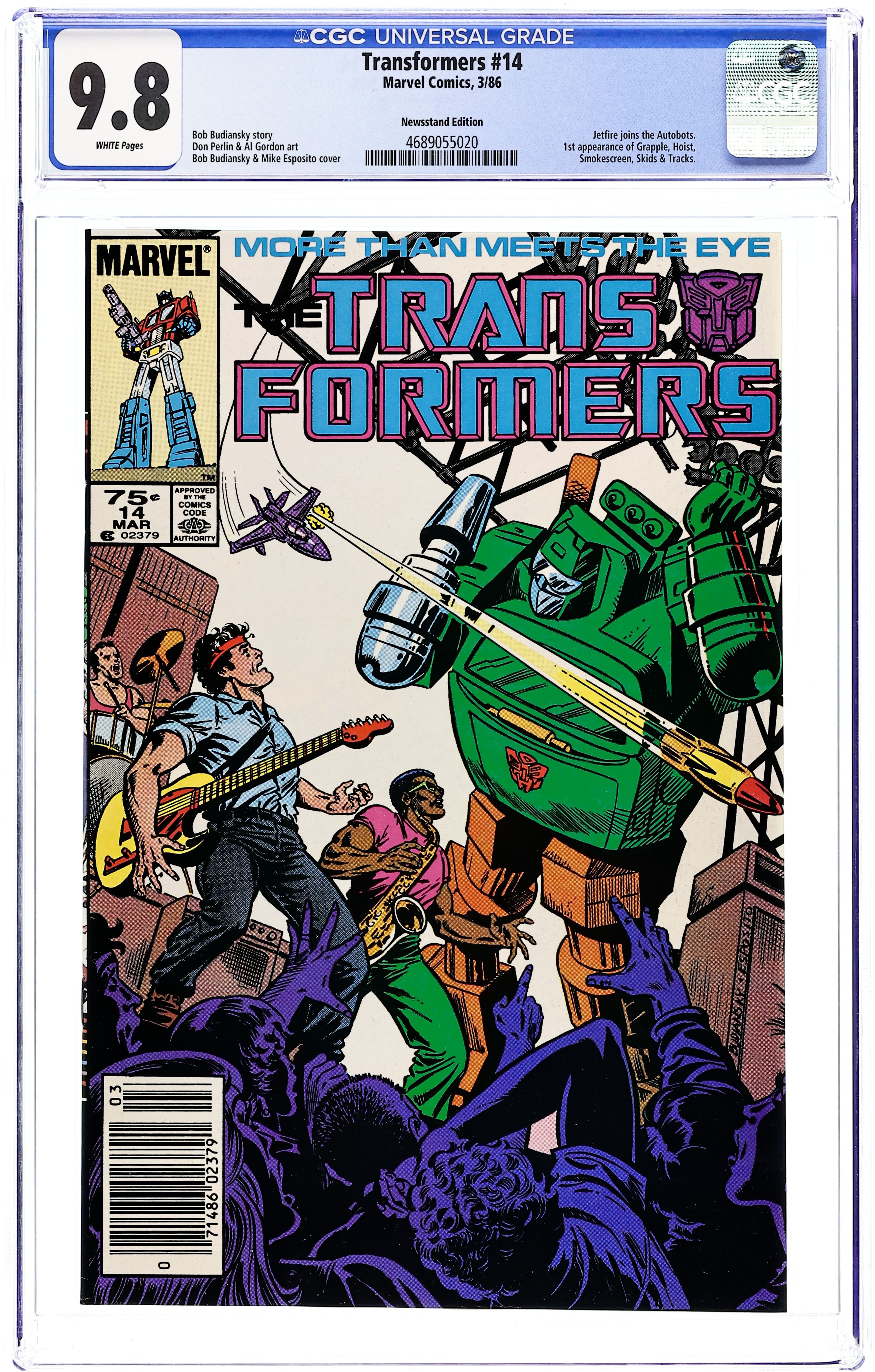 First Printing. Newsstand Edition. Jetfire officially joins the Autobots as they go out and blend into the world. While that is going on, Shockwave has come with a plan for new energon cubes which will enable the Decepticons to refuel with any form of energy in "Rock and Roll-Out." Script by Bob Budiansky and art by Don Perlin & Al Gordon. Cover by Bob Budiansky and Mike Esposito. Cover price $0.75.