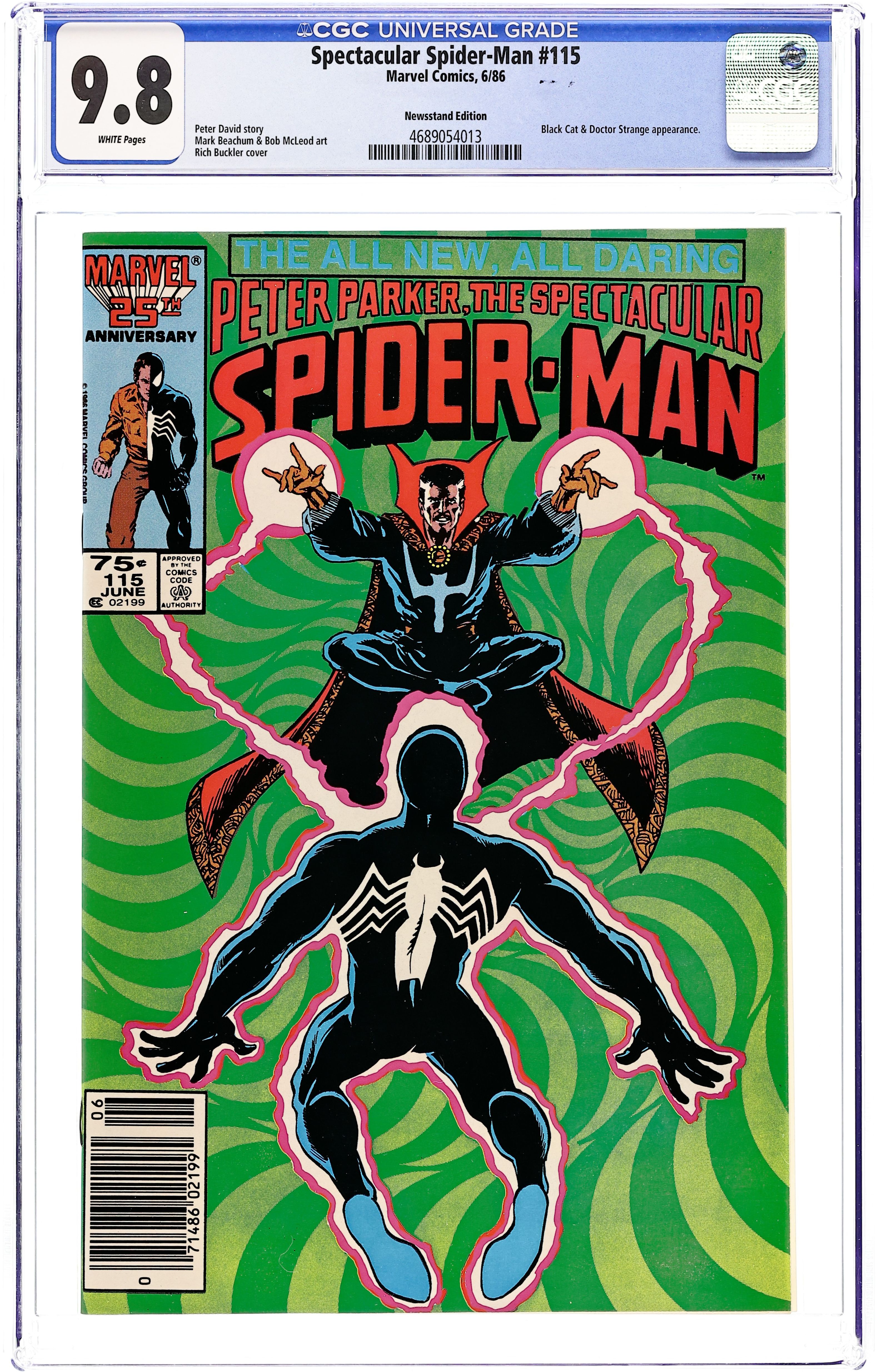 Newsstand Edition. "Things Fall Apart" Guest-starring Doctor Strange. Script by Peter David. Pencils by Mark Beachum. Inks by Bob McLeod. Peter Parker has been having an unusual amount of bad luck lately, so he decides to visit the Master of the Mystic Arts to see if something odd is going on. Indeed, the wall-crawler is surrounded by a bad luck aura, but Doctor Strange can remove it from both Spider-Man and the original source, Felicia Hardy. But how is this going to affect the Black Cat, who happens to be in the middle of a caper? Cameo appearance by the Foreigner. 32 pages Cover price $0.75.