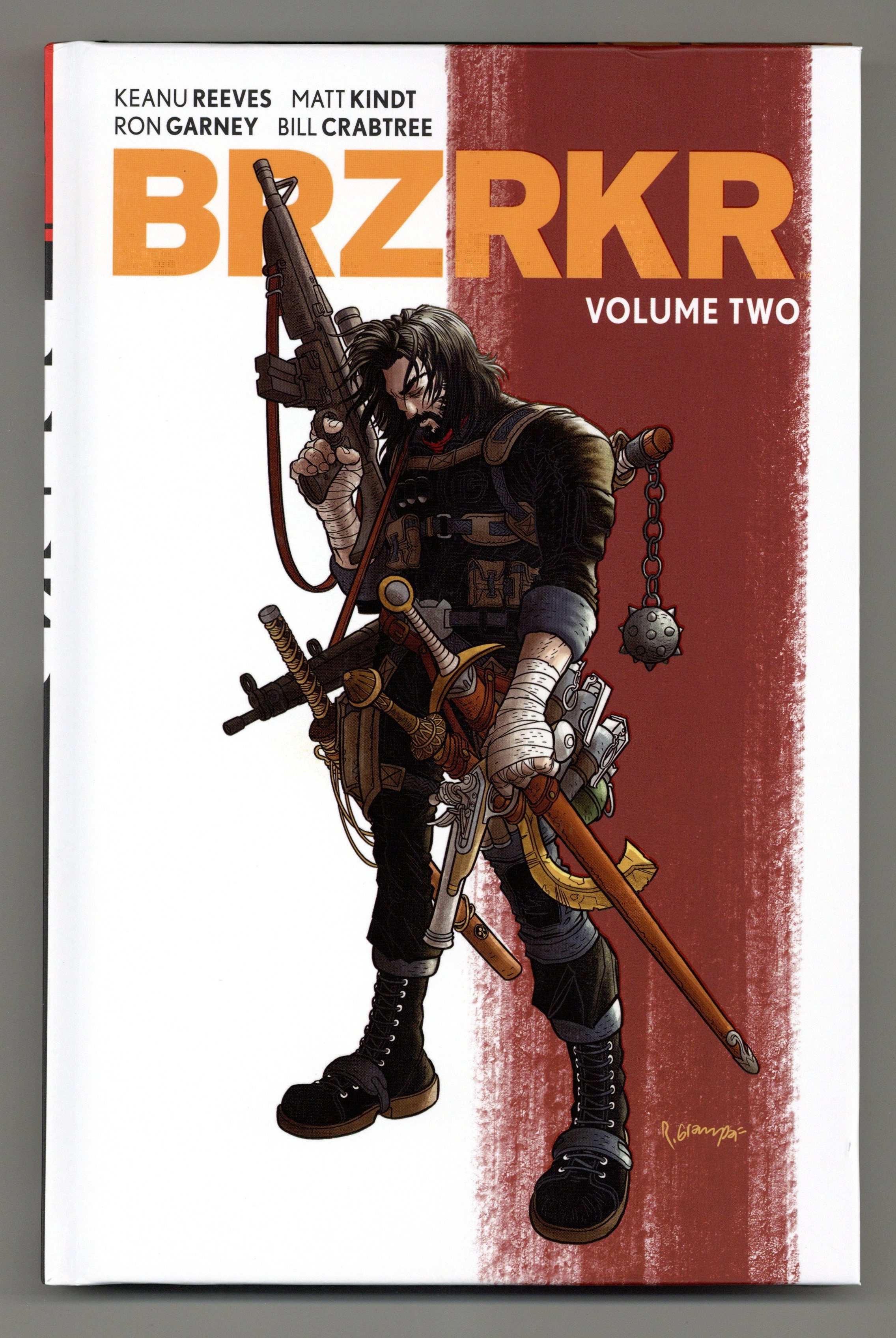 Hardcover - Volume 2 - 1st printing. Collects Brzrkr (2021 Boom) #5-8. Written by Keanu Reeves and Matt Kindt. Art by Ron Garney. Cover by Rafael Grampá. Half-mortal and half-god, cursed and compelled to violence, the man known only as B. begins wandering the world anew. After enduring a series of experiments and missions, B.'s memories of his origins will be finally restored. But what does this revelation mean for his future? Keanu Reeves continues his comic book writing debut alongside New York Times bestselling co-writer Matt Kindt (Folklords, Grass Kings) and legendary artist Ron Garney (Wolverine, Captain America) in a brutally violent new series about one immortal warrior's fight through the ages. Hardcover, 128 pages, full color. Mature Readers