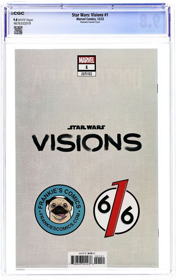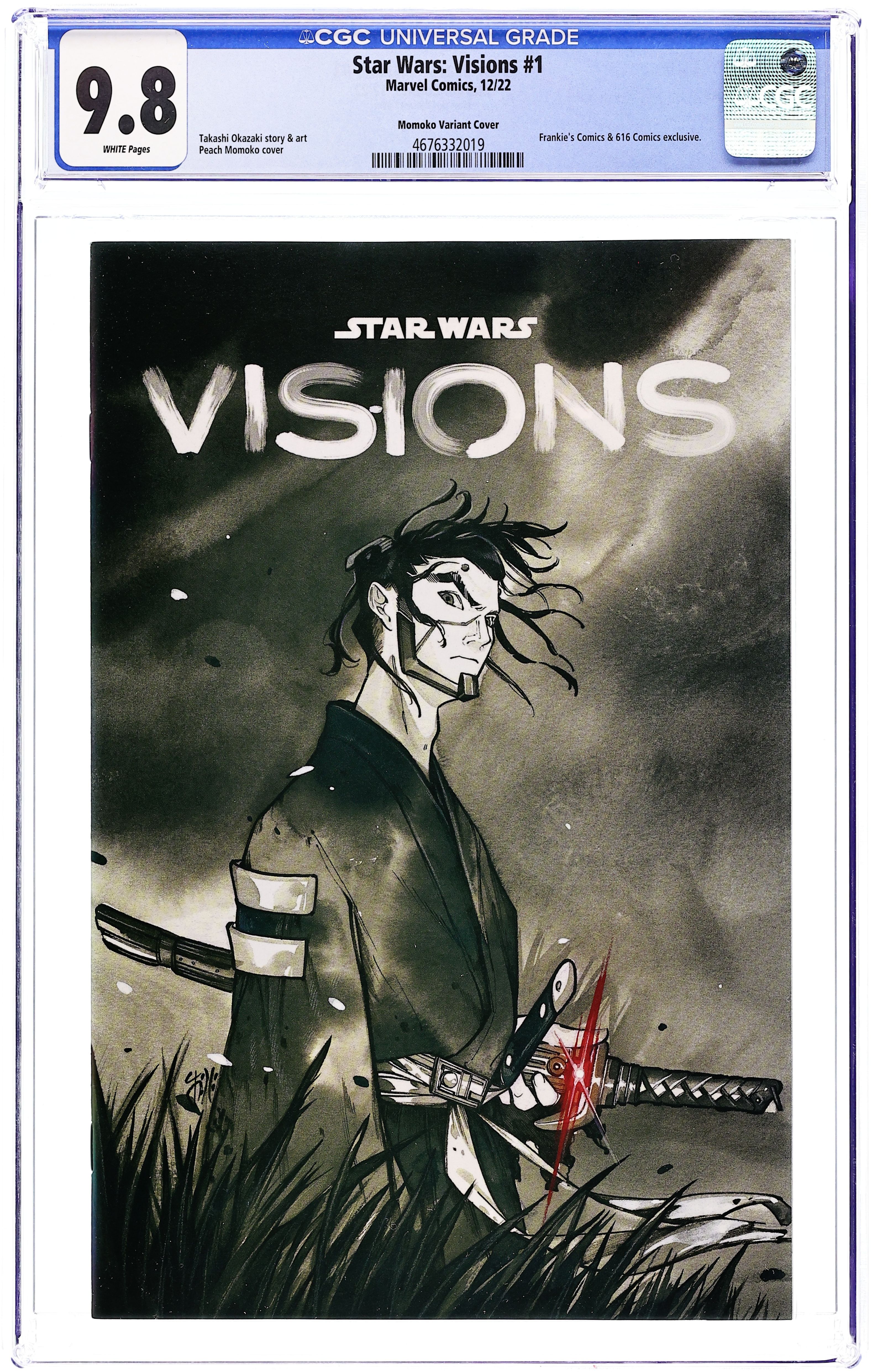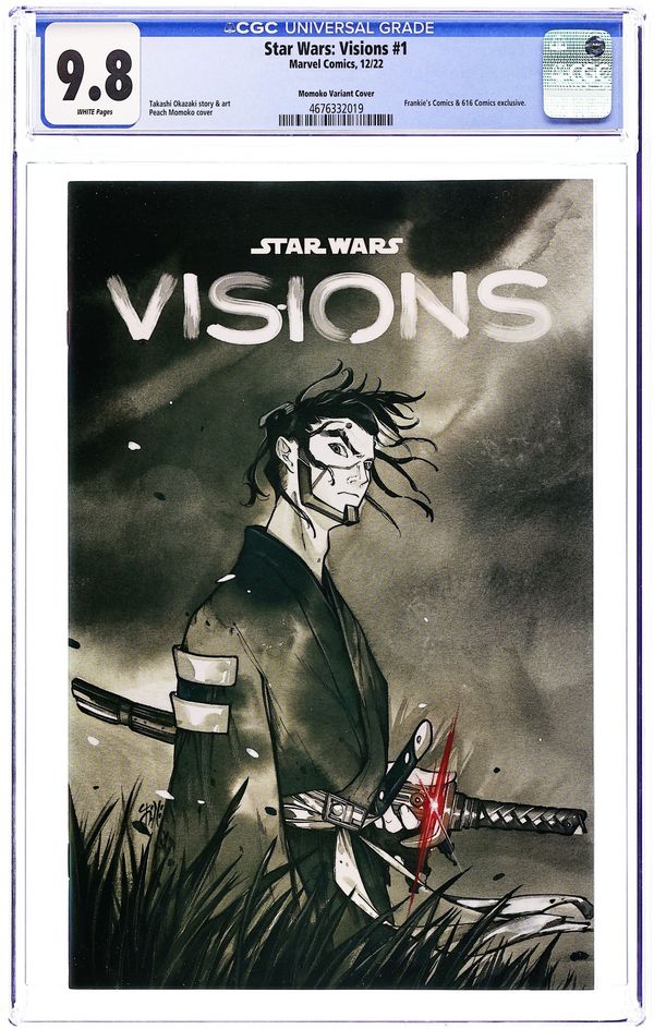 Frankie's Comics and The 616 Comics Exclusive Variant Cover by Peach Momoko. Written by Takashi Okazaki. Art by Takashi Okazaki. FROM ONE OF THE CREATIVE MINDS BEHIND THE STAR WARS: VISIONS EPISODE "THE DUEL" COMES AN ALL-NEW STORY! TAKASHI OKAZAKI (Afro Samurai) is continuing his storytelling from the acclaimed STAR WARS: VISIONS episode "THE DUEL," featuring the Ronin! With an art style depicted directly from THE DUEL – grey tones with exciting color for lightsabers and blasts - the mythology of STAR WARS infused with elements of Feudal Japan makes this issue a MUST READ for STAR WARS and MANGA fans alike! 40 pages, PC/B&W. Rated T Cover price $4.99.
