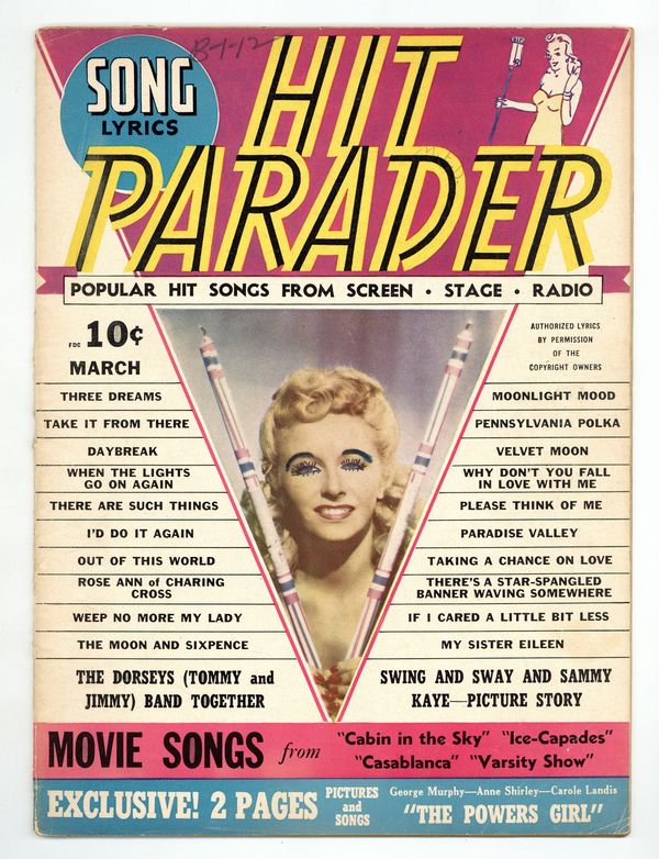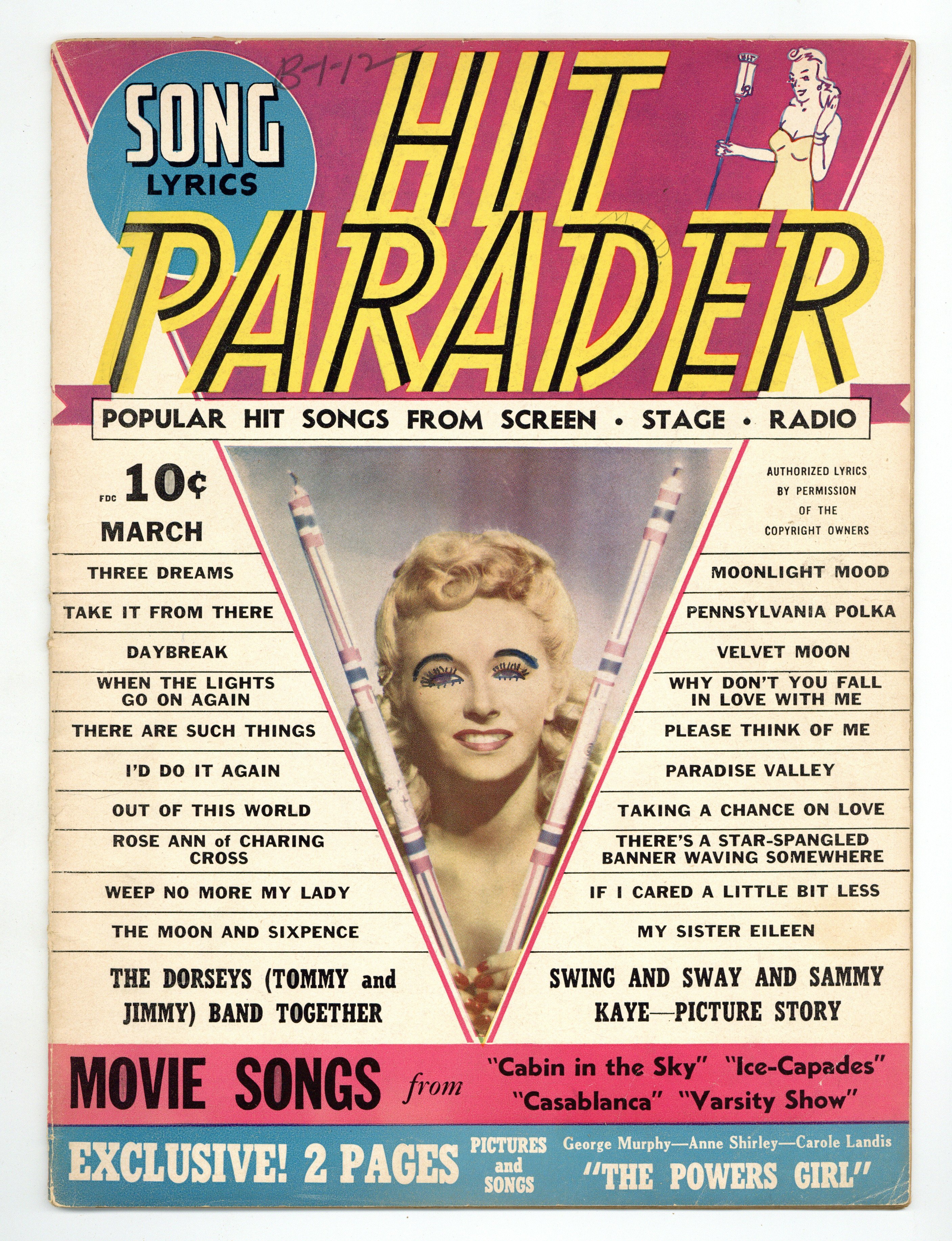 March 1943. Vera Hruba cover. This issue features photos and lyrics from Casablanca and Cabin in the Sky. Song lyrics, short gossip articles and period photographs. Long running music magazine featuring articles, song lyrics and fan letters. 8 1/2-in. x 11-in., 34 pages, B&W Cover price $0.10.