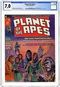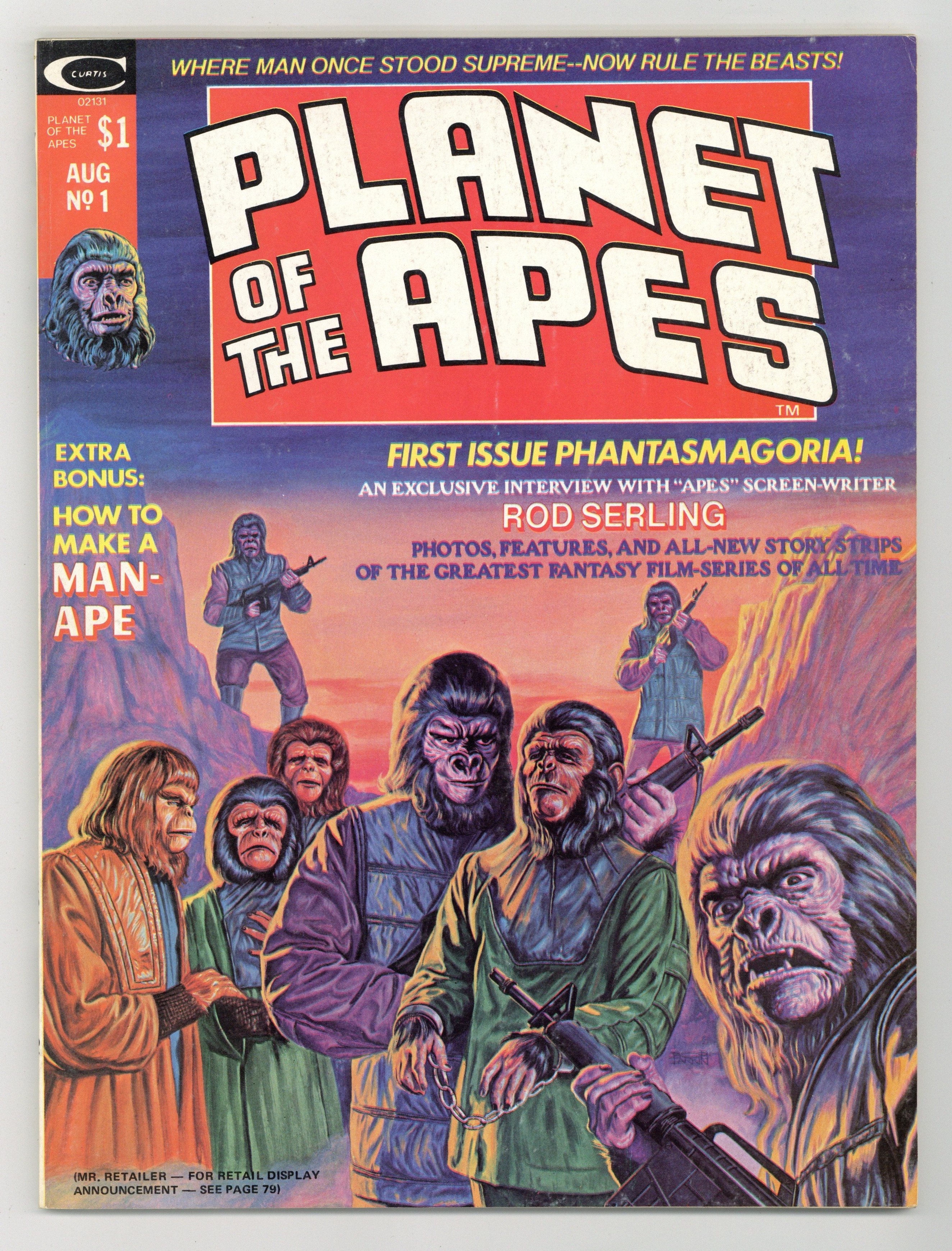 "Terror on the Planet of the Apes" (script by Doug Moench from an idea by Gerry Conway, art by Mike Ploog) and part one of an adaptation of the "Planet of the Apes" movie (script by Moench, pencils by George Tuska, inks by Mike Esposito). The rest of the issue consists of articles (with photos) and an interview with Rod Serling (who wrote the screenplay for the first Apes movie). Bob Larkin painted cover. Cover price $1.00.