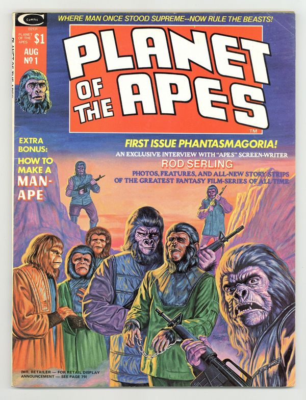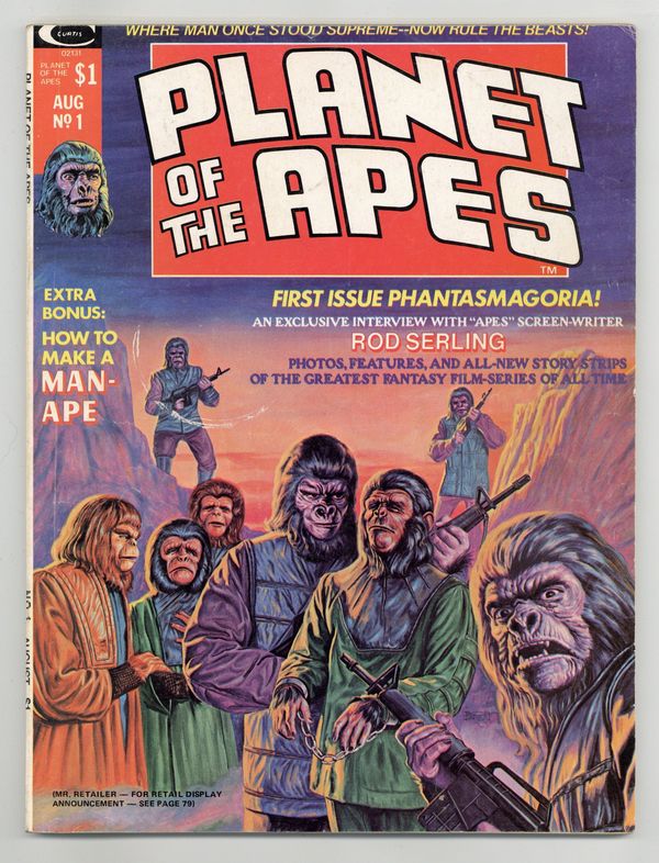 $19.50"Terror on the Planet of the Apes" (script by Doug Moench from an idea by Gerry Conway, art by Mike Ploog) and part one of an adaptation of the "Planet of the Apes" movie (script by Moench, pencils by George Tuska, inks by Mike Esposito). The rest of the issue consists of articles (with photos) and an interview with Rod Serling (who wrote the screenplay for the first Apes movie). Bob Larkin painted cover. Cover price $1.00.