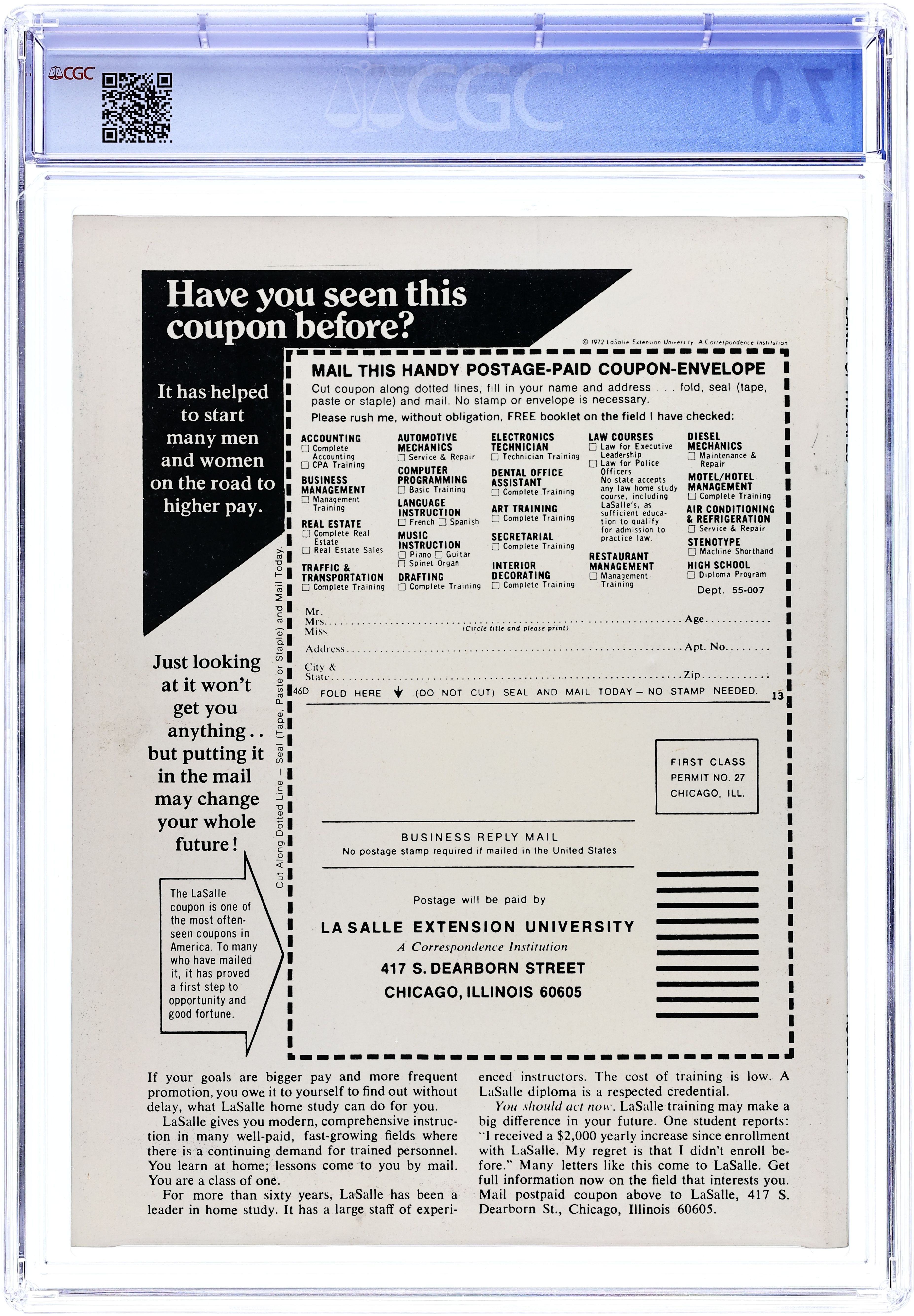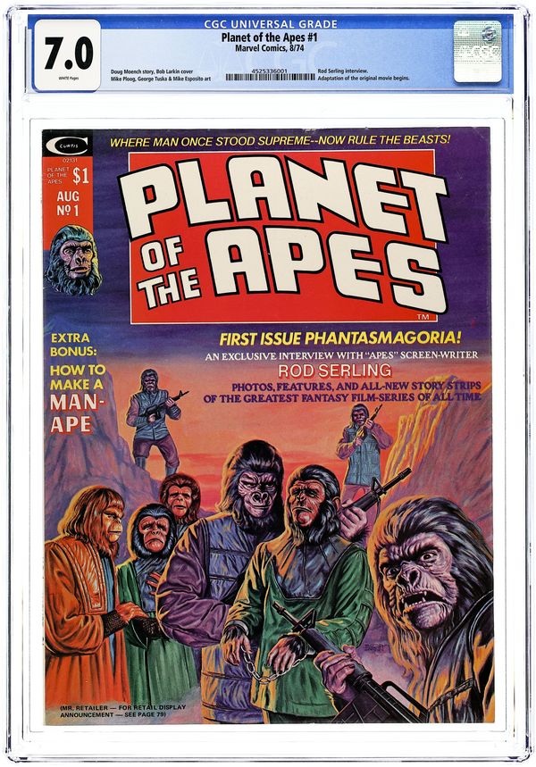 $50.00"Terror on the Planet of the Apes" (script by Doug Moench from an idea by Gerry Conway, art by Mike Ploog) and part one of an adaptation of the "Planet of the Apes" movie (script by Moench, pencils by George Tuska, inks by Mike Esposito). The rest of the issue consists of articles (with photos) and an interview with Rod Serling (who wrote the screenplay for the first Apes movie). Bob Larkin painted cover. Cover price $1.00.