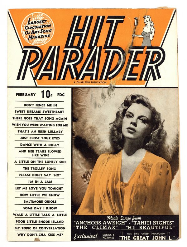 Judy Garland cover. This issue features photos and lyrics from Meet Me in St. Louis. Song lyrics, short gossip articles and period photographs. Long running music magazine featuring articles, song lyrics and fan letters. 8 1/2-in. x 11-in., 34 pages, B&W Cover price $0.10.
