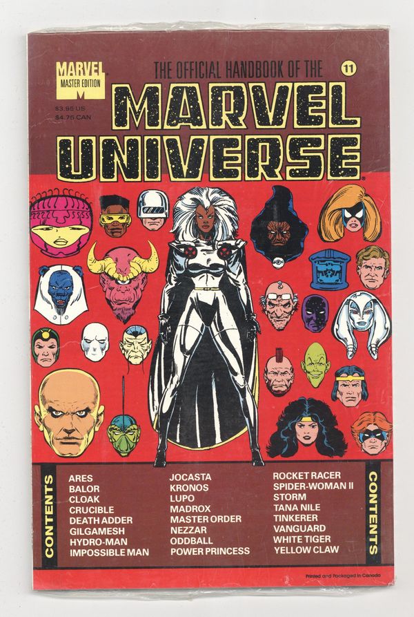 $4.5025 comprehensive profiles of Marvel's heroes and villains. Comic-sized and full-color, 25 cardstock pages plus cover. Master Editions were published in 3-hole punched looseleaf format. Each character is depicted 5-1/2" tall in full color in front, side and back views, making this series an invaluable tool for artists. Biographical data, physical description (height, weight, eye and hair color, etc.), powers and abilities, weaponry, accessories, costume notes are all detailed. Also included is a bibliography for each chararacter noting first appearance, origin issues and significant event issues. Characters profiled in this issue: Ares, Balor, Cloak, Crucible, Death Adder, Gilgamesh, Hydro-Man, Impossible Man, Jocasta, Kronos, Lupo, Madrox, Master Order, Nezzar, Oddball, Power Princess, Rocket Racer, Spider-Woman II, STORM, Tana Nile, Tinkerer, Vanguard, White Tiger, and Yellow Claw. Cover price $3.95.
