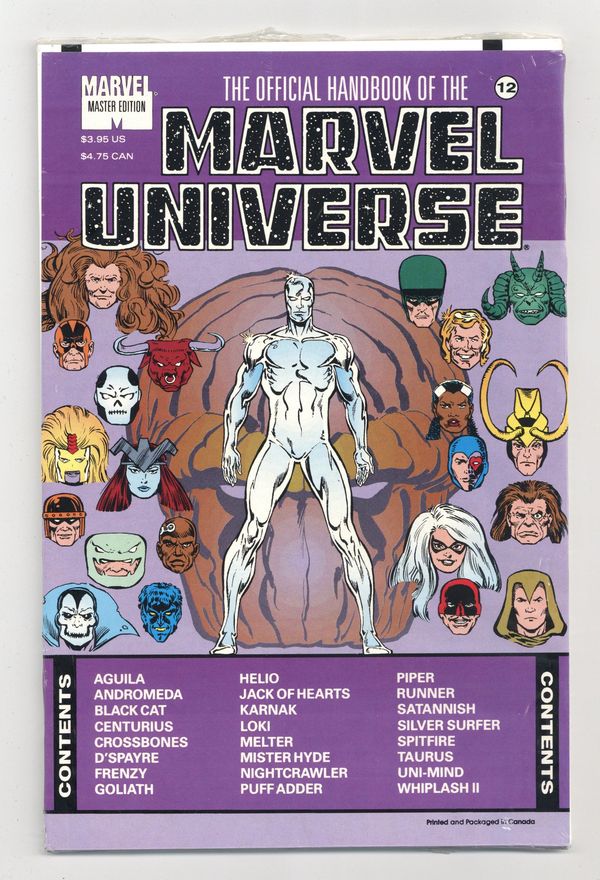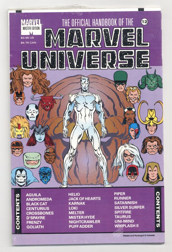 $6.0025 comprehensive profiles of Marvel's heroes and villains. Comic-sized and full-color, 25 cardstock pages plus cover. Master Editions were published in 3-hole punched looseleaf format. Each character is depicted 5-1/2" tall in full color in front, side and back views, making this series an invaluable tool for artists. Biographical data, physical description (height, weight, eye and hair color, etc.), powers and abilities, weaponry, accessories, costume notes are all detailed. Also included is a bibliography for each chararacter noting first appearance, origin issues and significant event issues. Characters profiled in this issue: Aguila, Andromeda, BLACK CAT, Centurius, Crossbones, D'Spayre, Frenzy, GOLIATH, Helio, JACK OF HEARTS, Karnak, LOKI, Melter, MISTER HYDE, NIGHTCRAWLER, Puff Adder, Piper, Runner, Satannish, SILVER SURFER, SPITFIRE, Taurus, Uni-Mind, Whiplash II. Cover price $4.50.