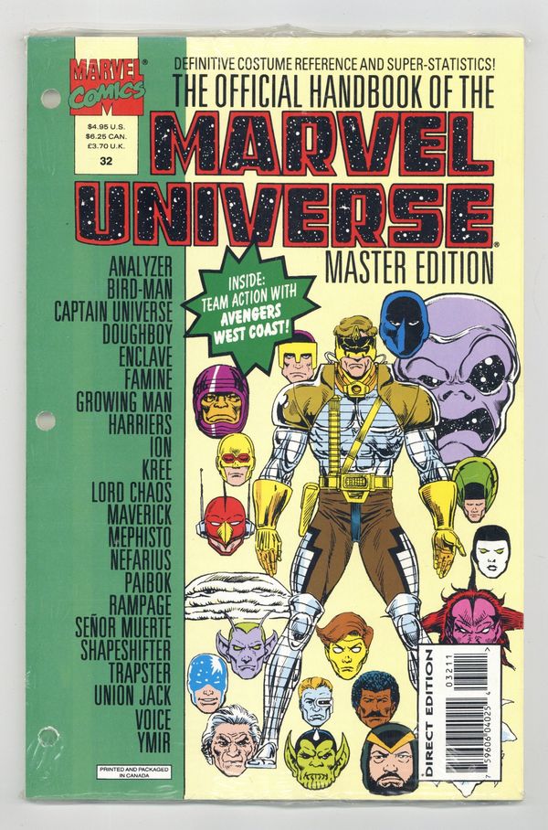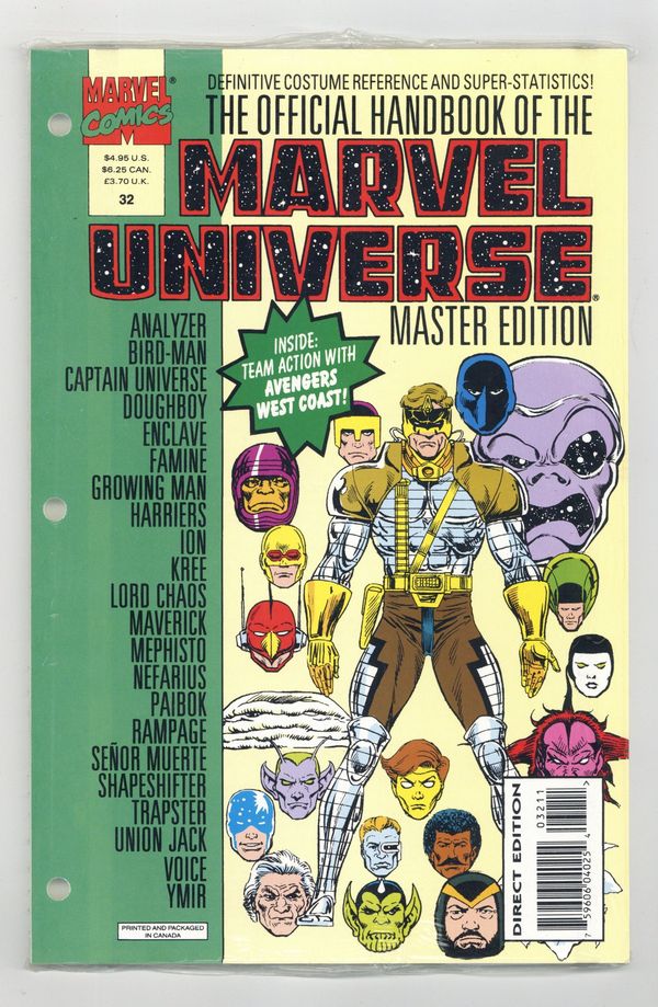 $10.0025 comprehensive profiles of Marvel's heroes and villains. Comic-sized and full-color, 25 cardstock pages plus cover. Master Editions were published in 3-hole punched looseleaf format. Each character is depicted 5-1/2" tall in full color in front, side and back views, making this series an invaluable tool for artists. Biographical data, physical description (height, weight, eye and hair color, etc., powers and abilities, weaponry, accessories, costume notes are all detailed. Also included is a bibliography for each chararacter noting first appearance, origin issues and significant event issues. Characters profiled in this issue: Analyzer, Bird-Man, Captain Universe, Doughboy, Enclave, Famine, Growing Man, Harriers, Ion, Kree, Lord Chaos, Maverick, Mephisto, Nefarius, Paibok, Rampage, Senor Muerte, Shapeshifter, Trapster, Union Jack, Voice, Ymir. Also: Avengers West Coast team action. Cover price $4.95.