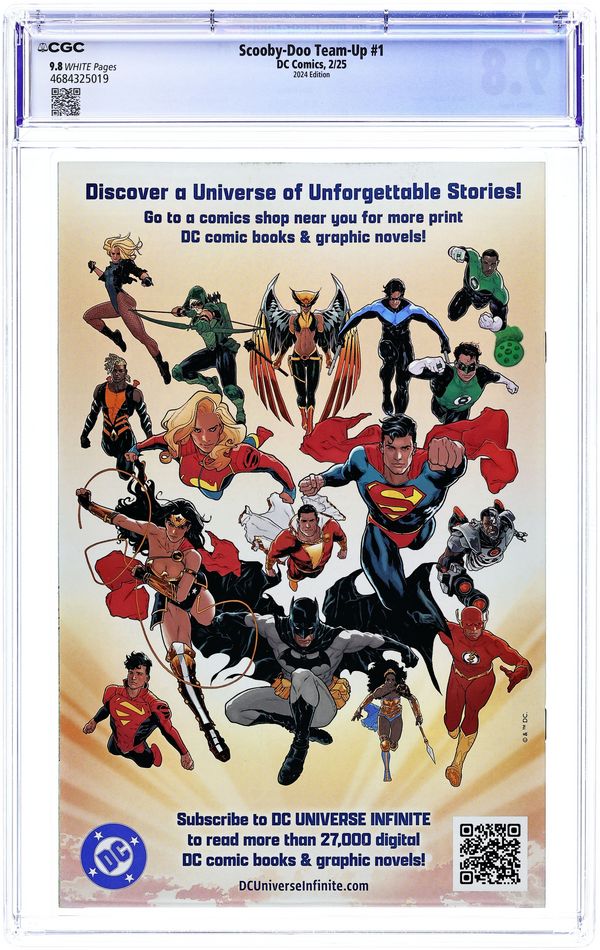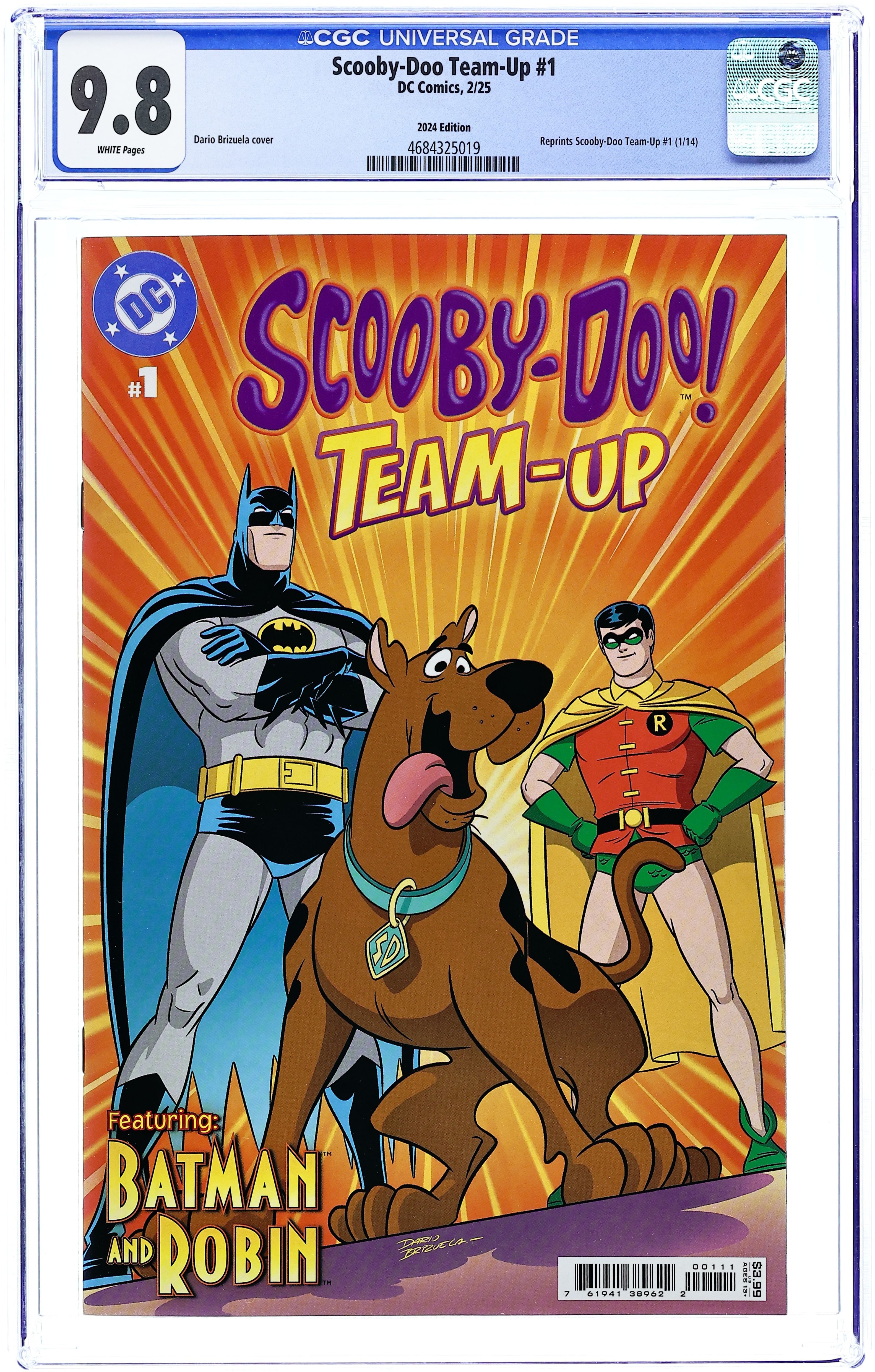 Dollar Tree/Circle K 2024 Reprint Edition. Reprints Scooby-Doo Team-Up (2013 DC) #1. Story by Sholly Fisch. Art and Cover by Dario Brizuela Rumors of a giant bat-creature bring Scooby and the gang on the run - but Batman and Robin are already on the trail of their old foe, the monstrous Man-Bat. Before long, the crooks behind a fake bat-creature will come face-to-face with the real thing... with the good guys caught in the middle! Don't miss the start of this new, bimonthly series! Cover price $3.99.