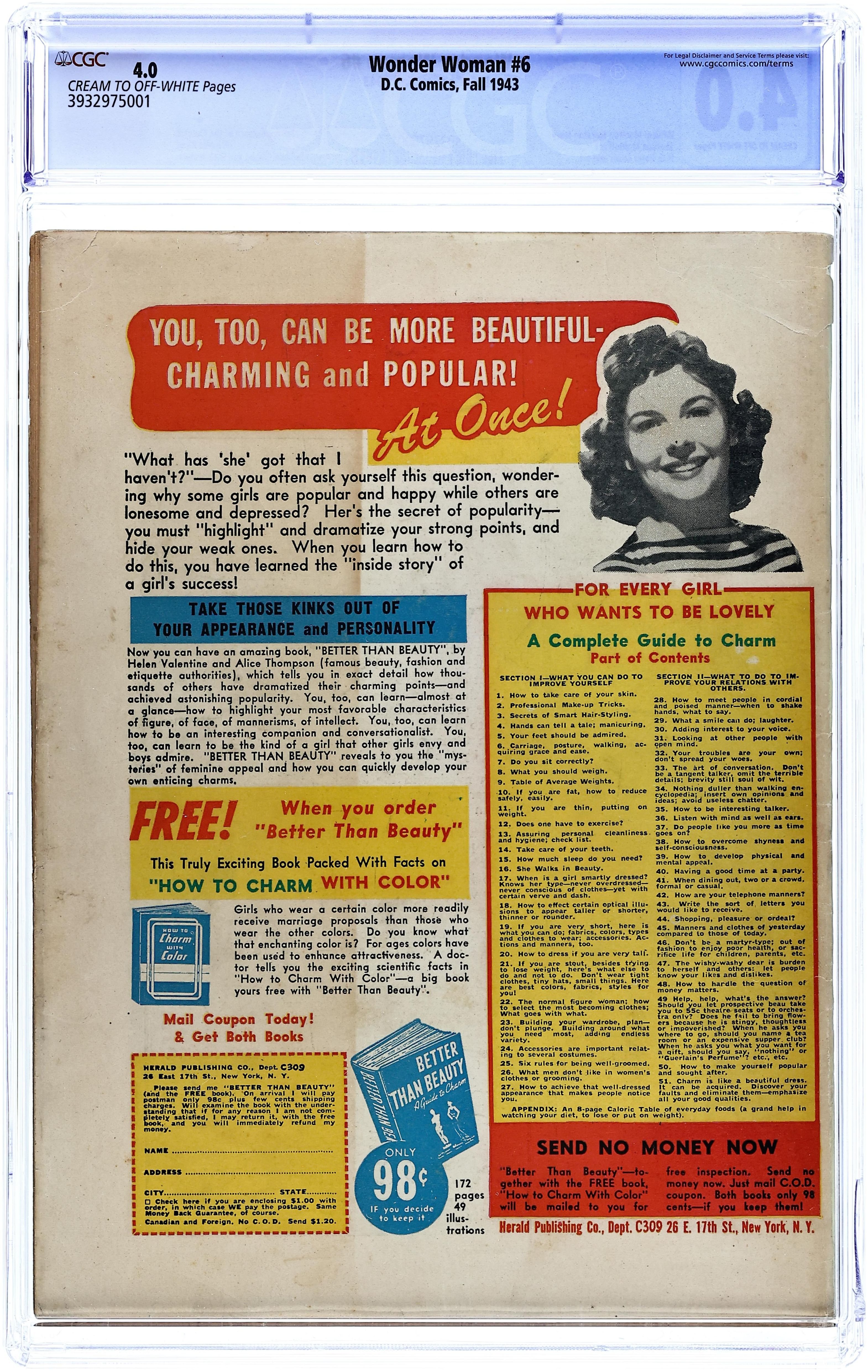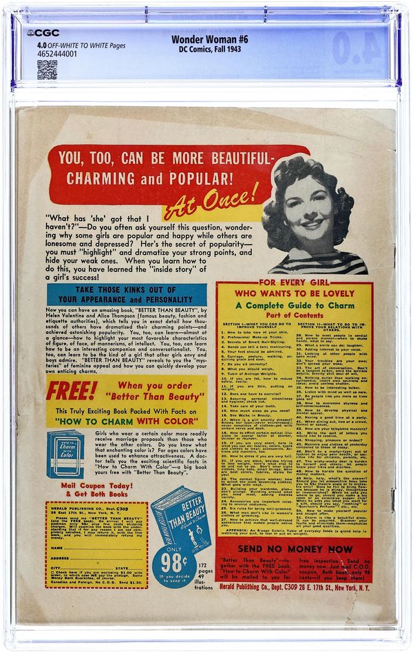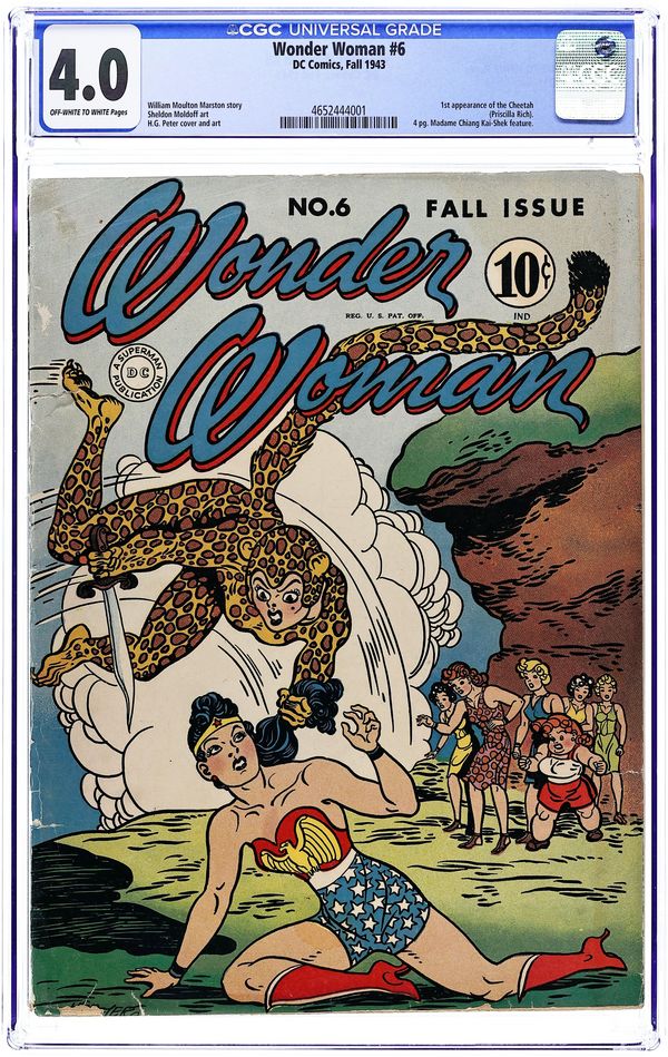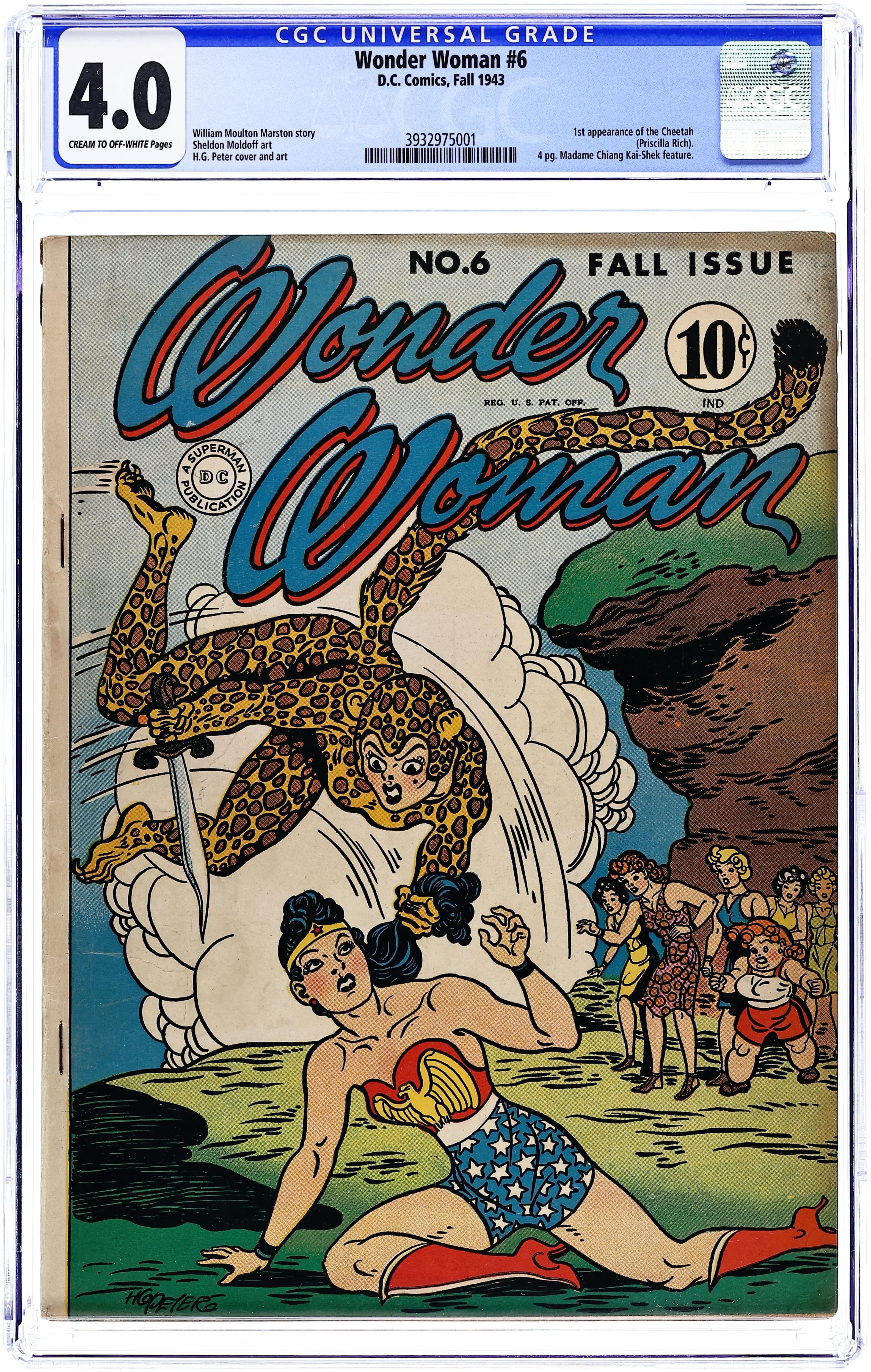 Cover by Harry G. Peter. 1st appearance of the Cheetah in "Wonder Woman and The Cheetah" script by William Moulton Marston (as Charles Moulton), art by Harry G. Peter; Upstaged by Wonder Woman at a charity event, a jealous socialite is overtaken by her evil alter ego, dons a Cheetah hide, and attempts to frame and kill her Amazon adversary. "The Adventure of the Beauty Club," script by William Moulton Marston (as Charles Moulton), art by Harry G. Peter; The Cheetah uses an exclusive beauty club as a front to learn military secrets from soldiers' families; Wonder Woman travels to the Pacific area to stop the Japanese from attacking an American base. "Hop Harrigan and the Radiosonde" text story. Women of History: four-page Madame Chiang Kai-Shek bio, script by Alice Marble, art by Sheldon Moldoff. "The Conquest of Paradise," script by William Moulton Marston (as Charles Moulton), art by Harry G. Peter; The Cheetah crashes a competition between Amazons and man's world girls on Paradise Island, seeking the source of the Amazons' strength to help her defeat Wonder Woman. 60 Pages, Full Color. Cover price $0.10.