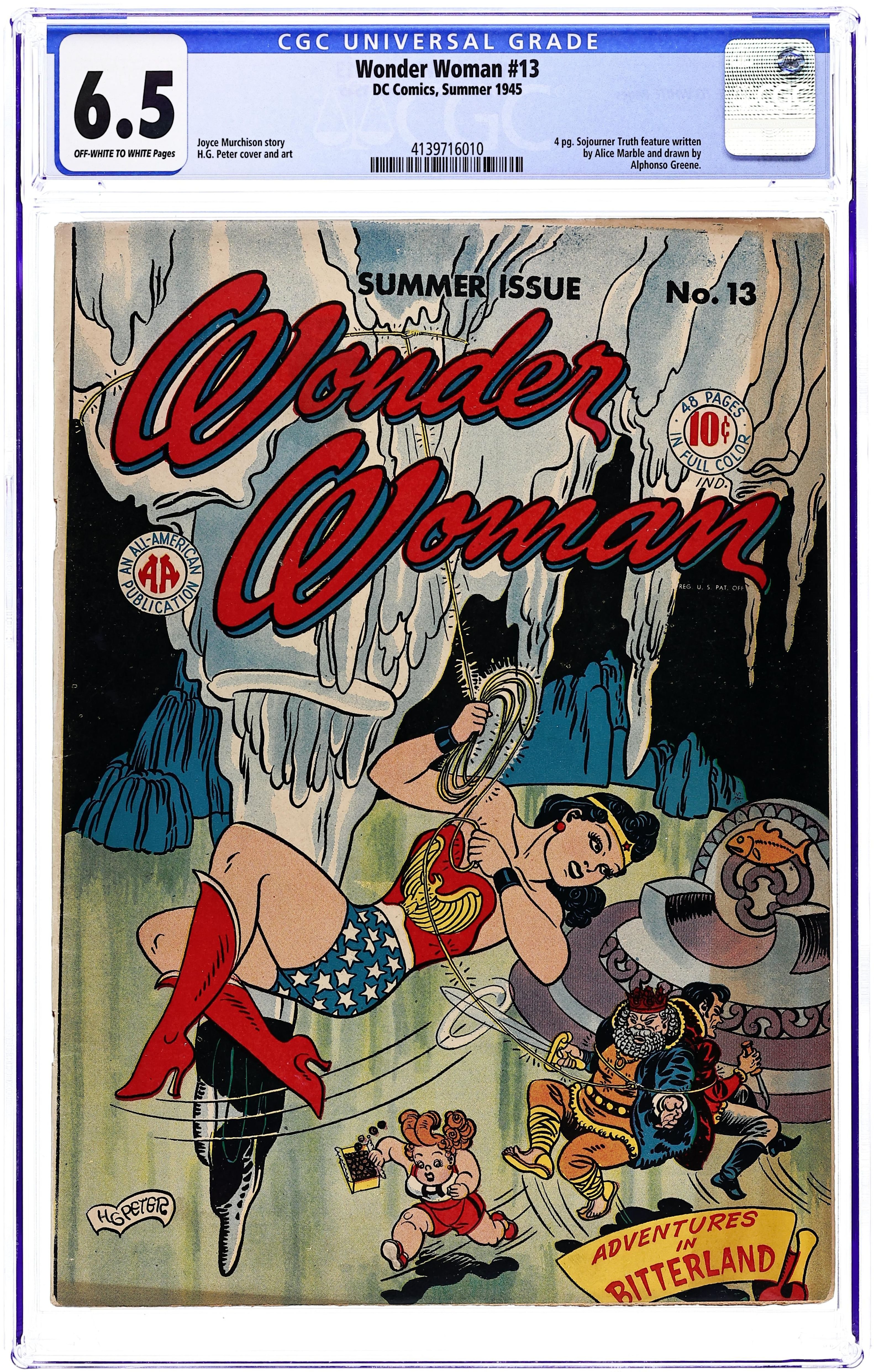 Cover by Harry G. Peter. "The Icebound Maidens," script by Joye Hummel (as Charles Moulton), art by Harry G. Peter; After helping a group of Amazon girls pass their initiation rites, Wonder Woman is sent by Aphrodite to inspire a race of Venusian women to repel their enemies: the evil Seal Men, who have kidnapped Eve, daughter of Queen Desira. "The Mystery Maid," script by Joye Hummel (as Charles Moulton), art by Harry G. Peter; When Princess Lectress goes missing, Queen Eve, with Wonder Woman's help, invades Bitterland to retrieve her. Wonder Women of History: four-page Sojourner Truth bio by Alice Marble, art by Alfonso Greene). Two-page text story, "The Man Who Hated Trees" by Jay Marr. "Slaves In the Electric Garden," script by Joye Hummel (as Charles Moulton), art by Harry G. Peter; While testing her new invention at the South Pole, Wonder Woman and Steve are captured by Seal Men and made slaves in the "Electric Garden," where they plan a revolt with the Eveland girls. One-page Tootsie Roll ad, "Captain Tootsie Captures Red the Terror" (by C.C. Beck and Pete Costanza). 52 Pages, Full Color. Cover price $0.10.