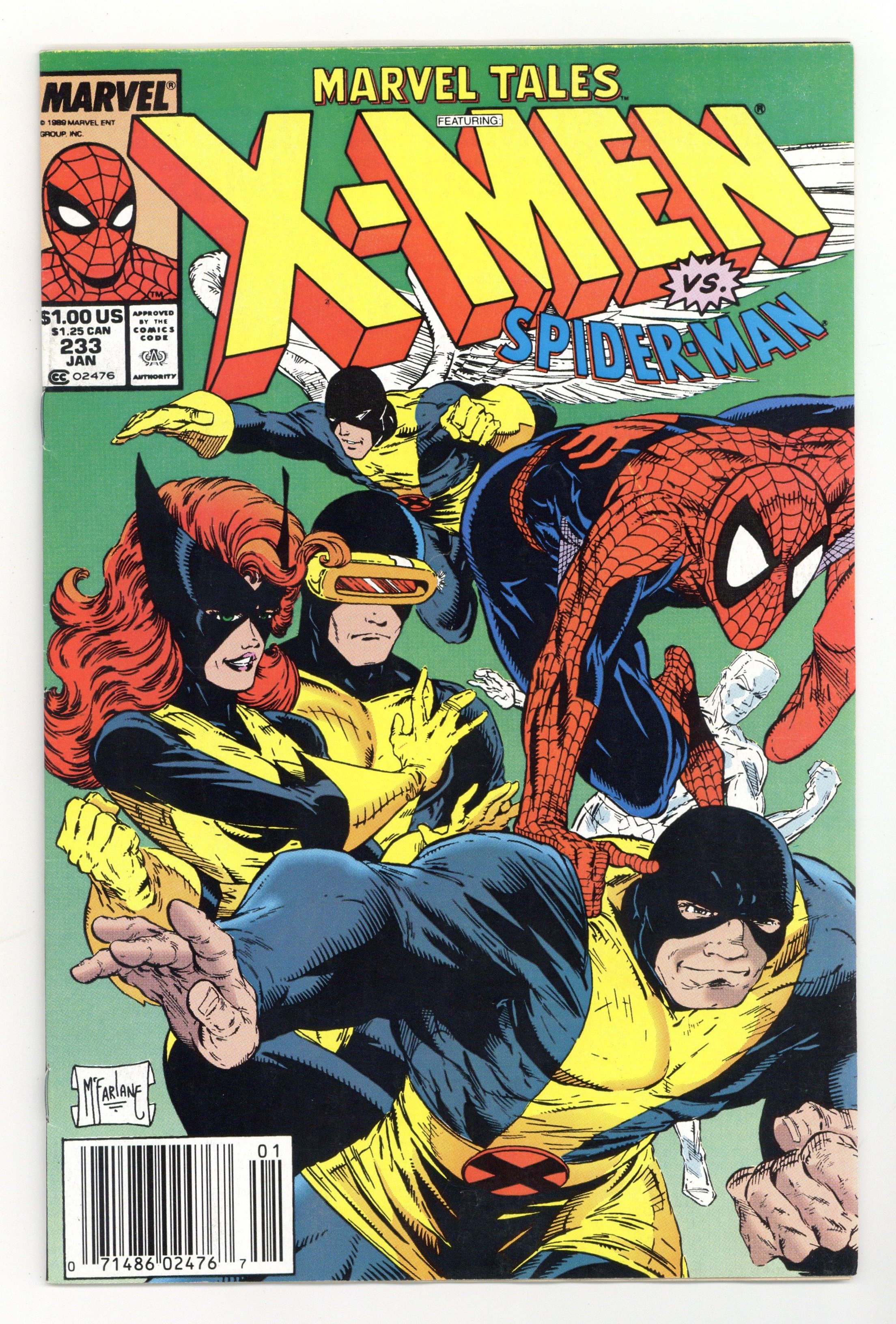 Newsstand Edition. Cover art by Todd McFarlane. Along Came a Spider, script by Roy Thomas, pencils by Werner Roth, inks by Dan Adkins; Banshee calls to the X-Men for help against a mysterious spider creature, and when the young mutants run across Spider-Man, they mistake him for their foe and a battle ensues; reprinted from X-Men (Marvel, 1963 series) #35. Too Much Zombie Business, script by Danny Fingeroth, pencils by Alan Kupperberg, inks by Jose Albelo; Mary Jane helps Spider-Ham overcome the brainwashing of the Marvel Zombies. 36 pgs. $1.00. Cover price $1.00.