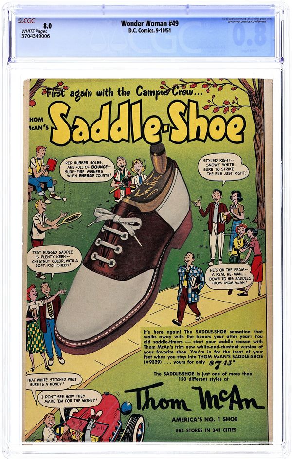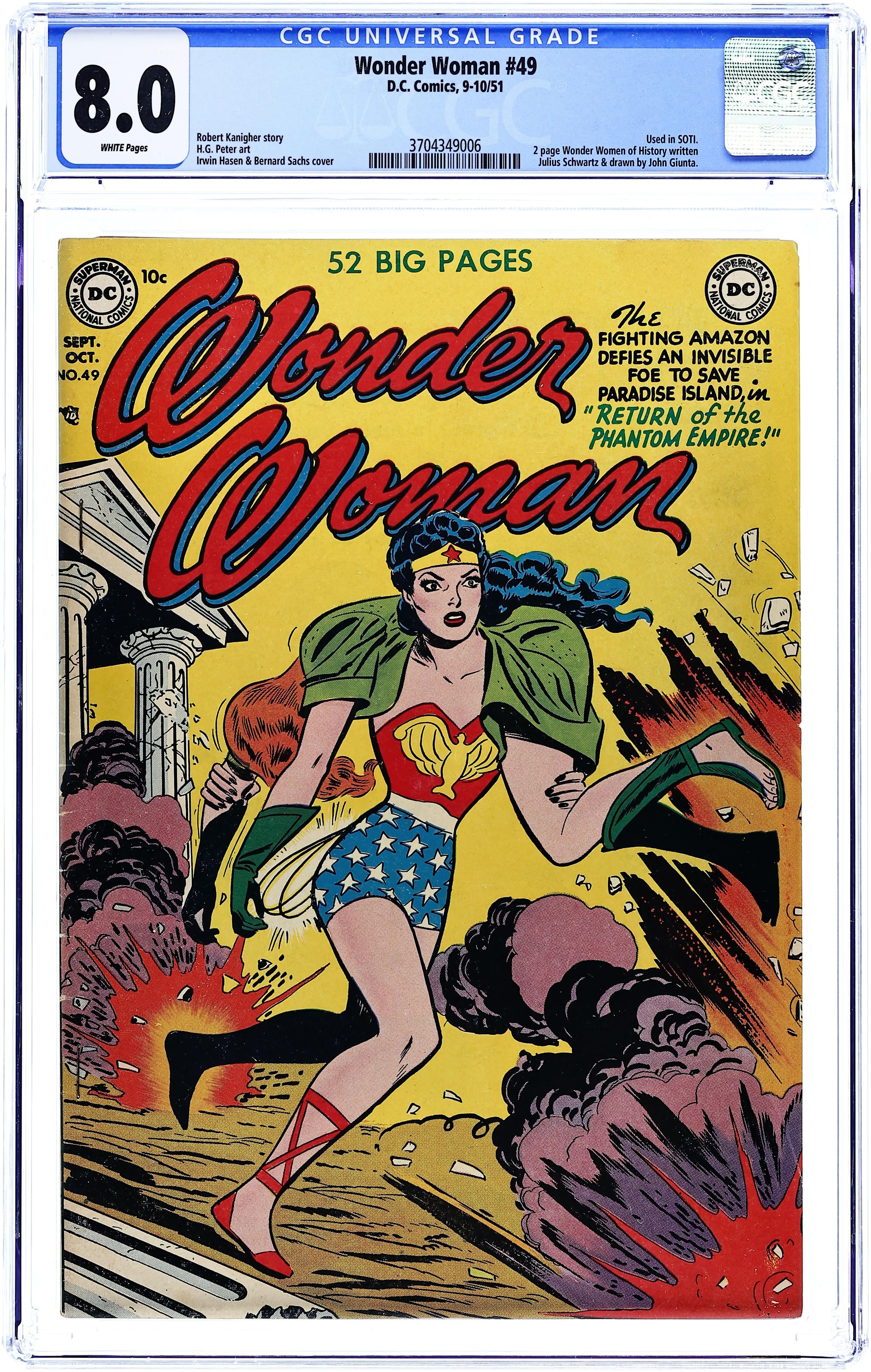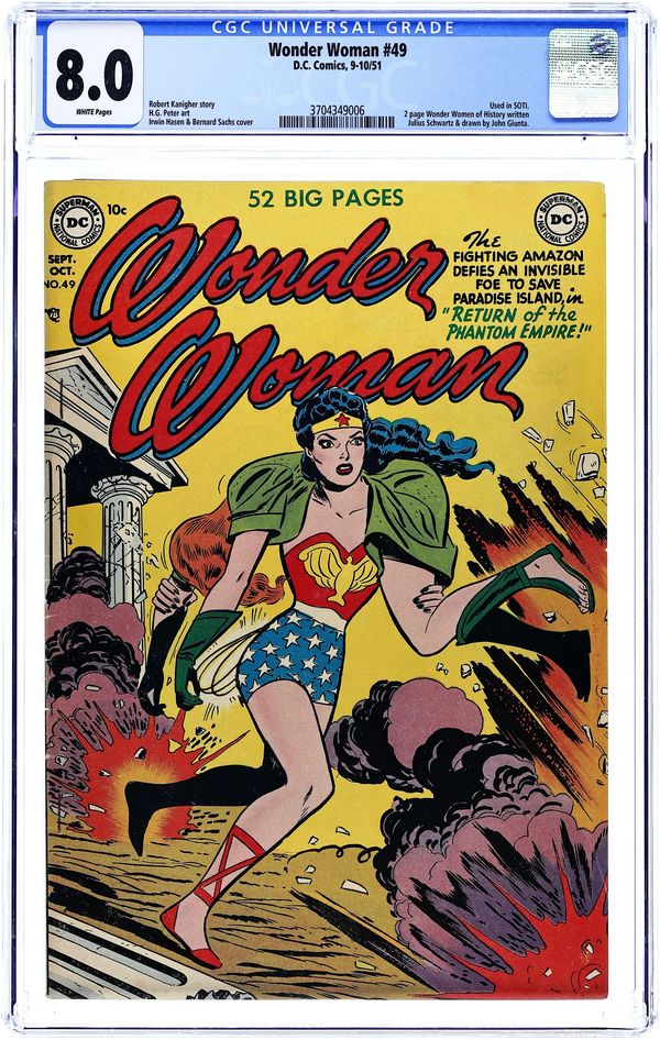 Cover pencils by Irwin Hasen, inks by Bernard Sachs. "Return of the Phantom Empire," script by Robert Kanigher, art by Harry G. Peter; Paradise Island finds itself at war with the land of Mu from 90 centuries ago! Jerry The Jitterbug humor page by Henry Boltinoff. "Little Miss Wonder Woman," script by Robert Kanigher, art by Harry G. Peter; Wonder Woman adopts a little girl who has lost her parents. Wonder Women of History: two-page Emilja Plater bio by Julius Schwartz, art by John Giunta. "Happy Landing" text story. "The Mystery of the Magic Typewriter," script by Robert Kanigher, art by Harry G. Peter Wonder Woman vs. leprechaun Moon O'Day; story used in Fredric Wertham's "Seduction of the Innocent." 52 Pages, Full Color. Cover price $0.10.
