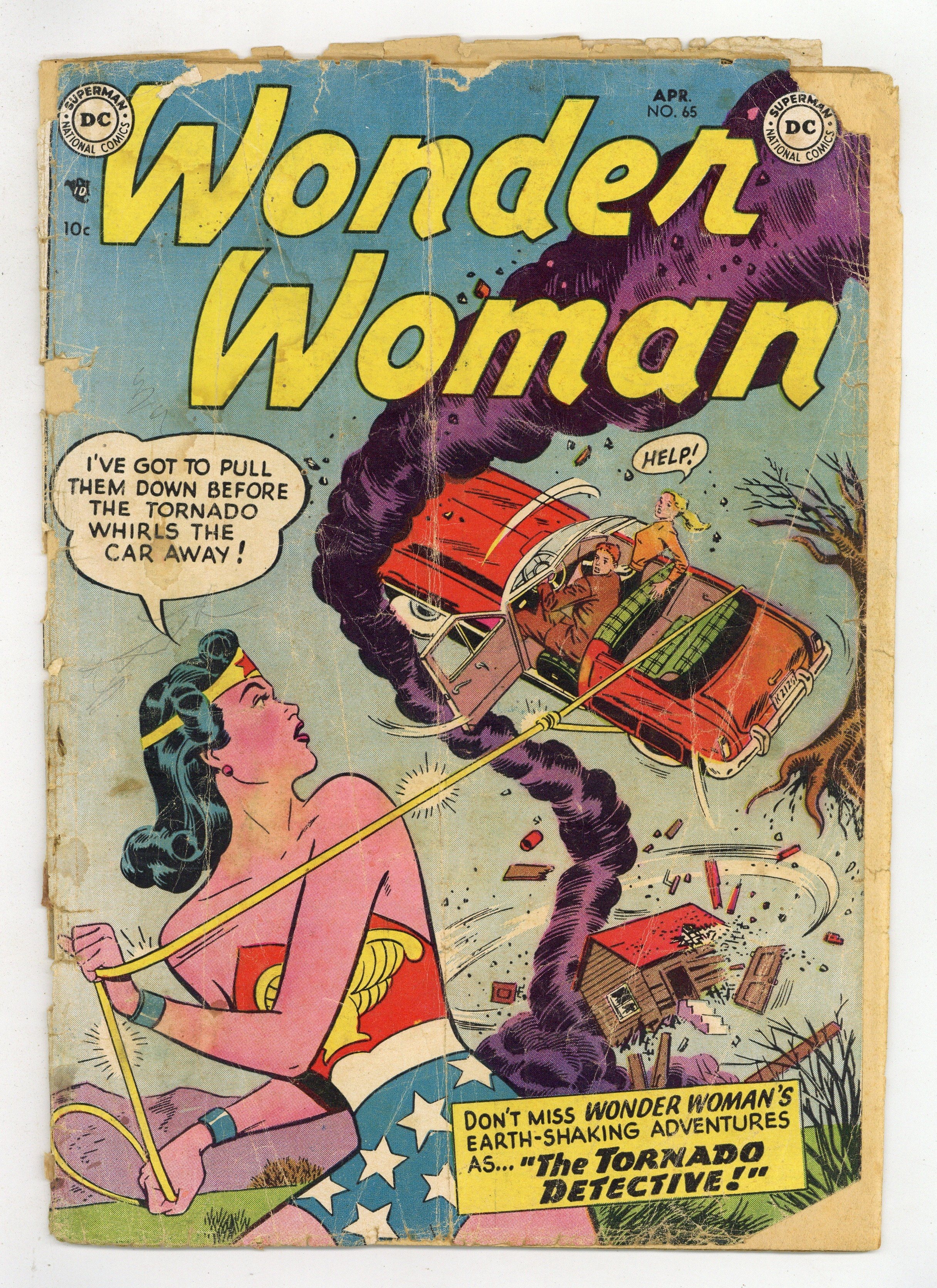 Cover pencils by Irwin Hasen, inks by Bernard Sachs. "The Stone Slayer," script by Robert Kanigher, art by Harry G. Peter; Wonder Woman is captured by the statues from Easter Island. "The Tornado Detective," script by Robert Kanigher, art by Harry G. Peter; Wonder Woman battles a flying saucer that creates tornadoes. Wonder Women of History bio on Florence Rena Sabin by Julius Schwartz, art by John Giunta. Your Favorite Color text article. "The Last Amazon," script by Robert Kanigher, art by Harry G. Peter; Wonder Woman wakes to find she's been shrunken and stuck in a display case along with Steve Trevor and some others; Then she finds out Duke Deception has conquered Earth. 36 pages, Full Color. Cover price $0.10.