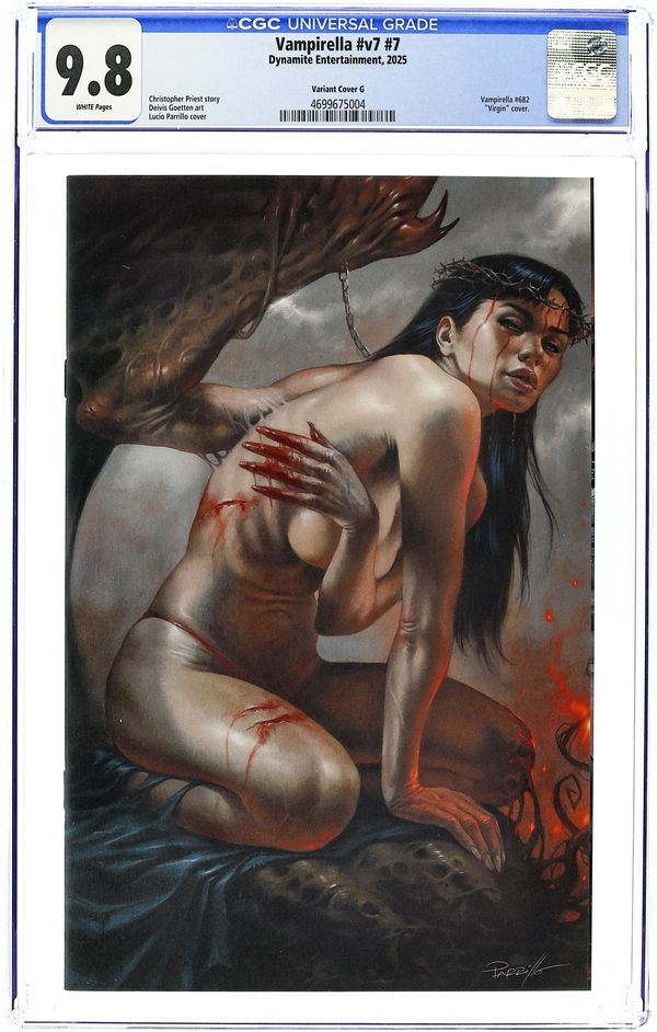 Limited Edition Virgin Cover by Lucio Parrillo. Story by Christopher Priest. Art by Deivis Goetten. Following the devastating denouement of 'The Long Night,' a distraught Vampirella retreats to her refuge on the tiny Caribbean island of Tortola to find comfort in the arms of her lover, the Saint. Once there, however, Vampirella's grief attracts the lingering spirit of her deceased friend, Benny the Witch, who warns her that the Saint- her only tether to sanity is actually a grave threat to the world. If humanity is to survive, the Saint must die! Legendary author CHRISTOPHER PRIEST and artist DAVIS GOETTEN kick off the latest chapter in the Daughter of Drakulon's saga with Vampirella #7-crowned with captivating covers from LUCIO PARRILLO, DERRICK CHEW, JOSEPH MICHAEL LINSNER, ELIAS CHATZOUDIS, and cosplay by RACHEL HOLLON! 32 pages, rated Teen +, full color Cover price $50.00.