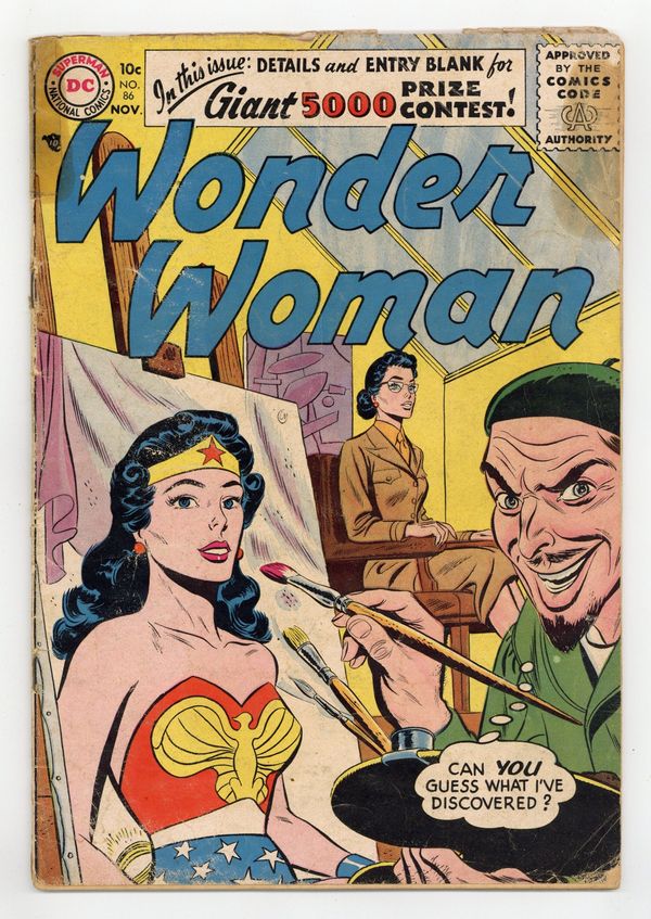 Cover by Irv Novick. "The Painting That Betrayed Wonder Woman," script by Robert Kanigher, art by Harry G. Peter; Vincent Brian paints people as the really are, so when he does a portrait of Diana, it comes out as Wonder Woman. "The Talking Robot Plane," script by Robert Kanigher, art by Harry G. Peter; Wonder Woman loans her plane to a museum where it brags to the other exhibits about its exploits. Ancient Beauty Secrets article. "The Mystery of the Magnetic Footprints," script by Robert Kanigher, art by Harry G. Peter; Rakko uses magnetism to rivet Wonder Woman to one spot. 36 pages, Full Color. Cover price $0.10.