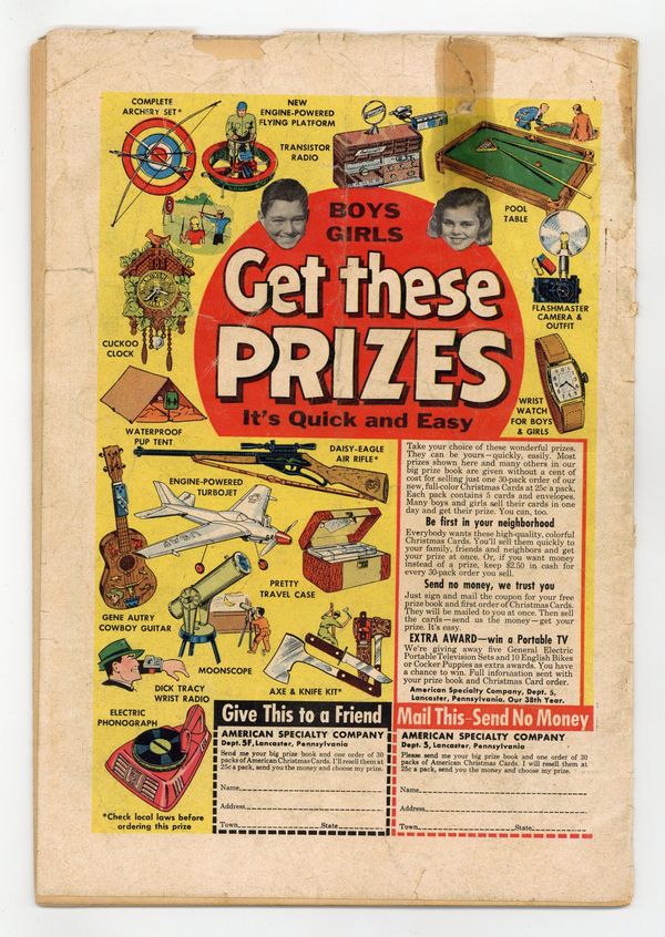 Tags: Wonder Woman$100.00- 1 1/4" Cumulative spine split. 1 1/4" tear on back cover. Tape. Heavy water damage. Staple added (not manufacturing).