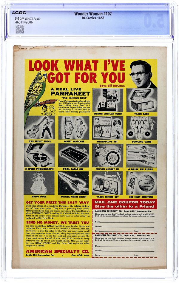 Cover pencils by Ross Andru, inks by Mike Esposito. "The Three Faces of Wonder Woman: Ch. 1: The First Face of Wonder Woman," script by Robert Kanigher, pencils by Ross Andru, inks by Mike Esposito; Wonder Woman and Steve Trevor are transported to another dimension inhabited by giants. Bebe humor page by Henry Boltinoff. "The Three Faces of Wonder Woman: Ch. 2: The Second Face of Wonder Woman," script by Robert Kanigher, pencils by Ross Andru, inks by Mike Esposito; Steve Trevor is challenged to find the real Wonder Woman among three possible choices. Laurel of Love non-fiction half-page, script by Julius Schwartz, pencils by Morris Waldinger, inks by Tommy Nicolosi. Marriage a la Mode non-fiction page, script by Julius Schwartz, pencils by Morris Waldinger, inks by Tommy Nicolosi. "The Three Faces of Wonder Woman: Ch. 3: The Third Face of Wonder Woman," script by Robert Kanigher, pencils by Ross Andru, inks by Mike Esposito; Steve determines which is the true Wonder Woman among the three choices by her kiss. 36 pages, Full Color. Cover price $0.10.