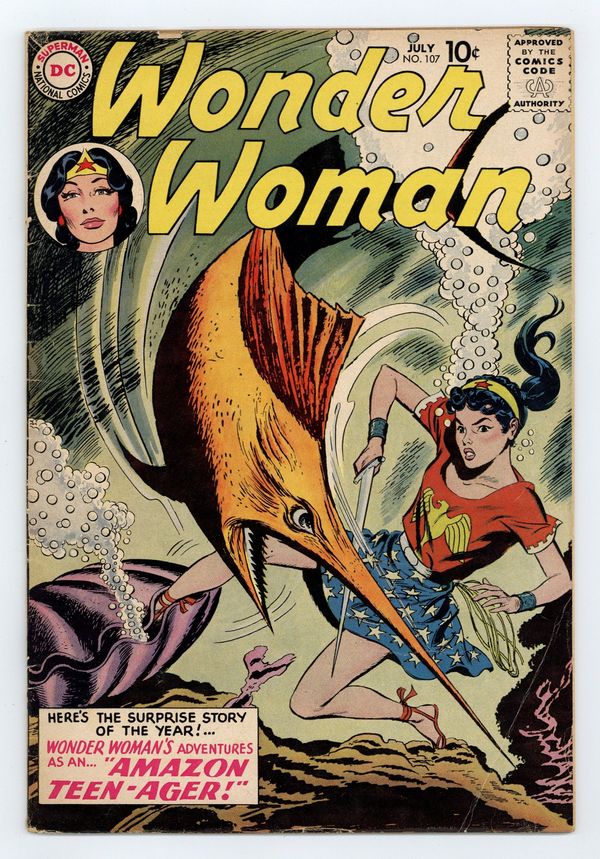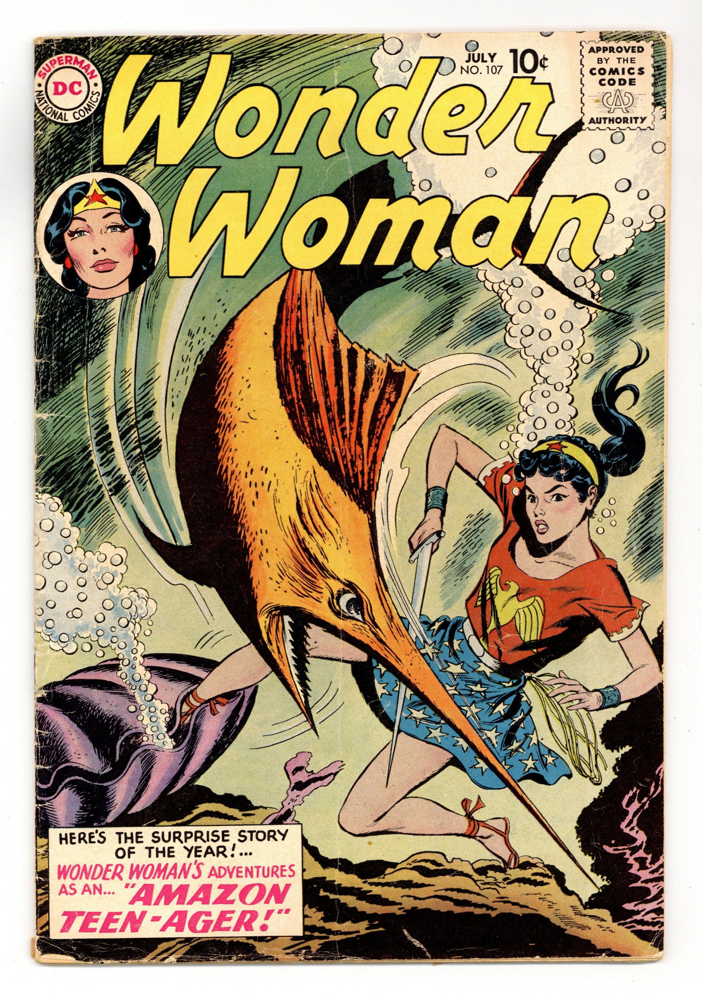 Cover pencils by Irwin Hasen, inks by Bernie Sachs. "Wonder Woman Amazon Teen-Ager," script by Robert Kanigher, pencils by Ross Andru, inks by Mike Esposito; Origin of Wonder Girl's costume. After watching her future adventures as Wonder Woman on the Amazon Time and Space Televisor, Wonder Girl wants a costume of her own, but has to win it by performing great feats. "Gunslingers of Space!", script by Robert Kanigher, pencils by Ross Andru, inks by Mike Esposito; Aliens, disguised as cowboys, terrorize the Earth; Wonder Woman steps in. 36 pages, Full Color. Cover price $0.10.