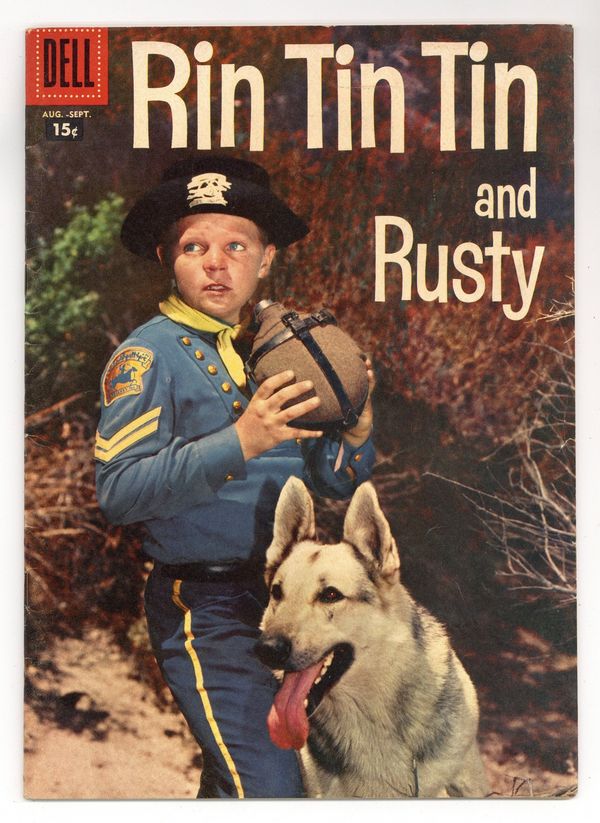 Published Sep 1957 by Dell/Gold Key.$40.0015c Cover Price Edition. Photo cover of the famous dog. The Rebel, art by Sparky Moore; Sergeant O'Hara tries make a soldier out of Private Donahue, but he finds it's not easy. Untitled Paul Bunyan, Jr. story, art by August Lenox; Paiute Smith and Paul have a shooting contest. The Sheriff's Chair text story. Open Season, art by Sparky Moore; Lord Burleigh and Rinty go on a little hunting trip. 36 pages, full color. Cover price $0.15.
