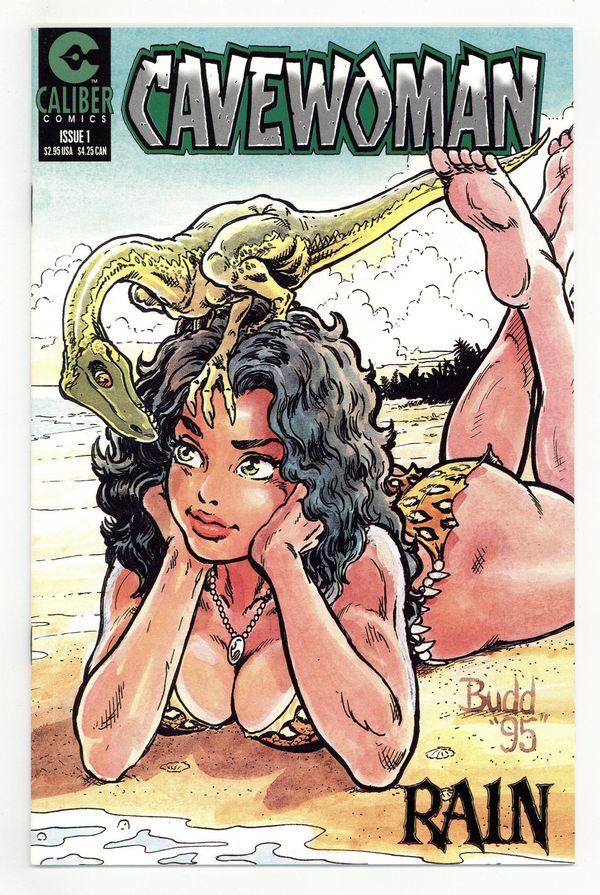 First Printing. NOTE: Reprints are labeled "Special Second Printing" and "Special Third Edition" across top of cover. Story, art and cover by Budd Root. The second series featuring voluptuous superwoman Meriem Cooper, who battles dinosaurs in the distant past. Following the events of the original Cavewoman series, the people of Marshville find trouble while trying to restore power. Meanwhile, Meriem rescues a baby whose parents were killed by dinosaurs. 32 pages, B&W. Mature readers. Cover price $2.95.