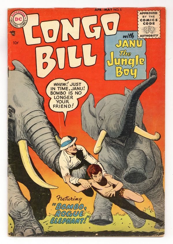 "Bombo, Rogue Elephant!" To capture thieves that are intent on stealing a map that is taped around Bornbo's tusk, Congo Bill pretends to kill a bad elephant. Also includes: "The Return of Prince Padhan!"; "The Sun-Born Mountain Man"; and "The Mysterious Jungle!" Cover by Nick Cardy. Cover price $0.10.