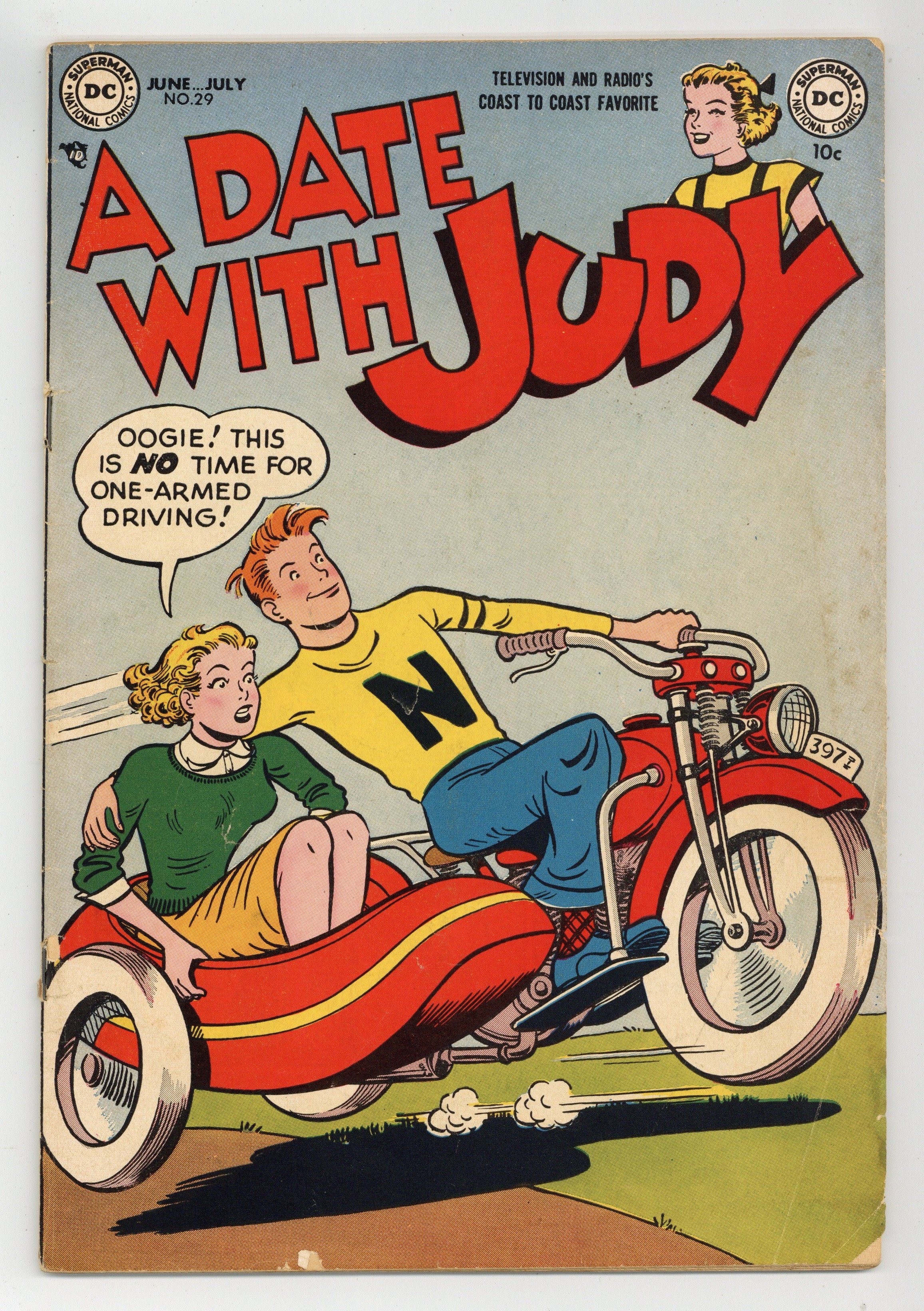 Stories by Henry Boltinoff and unknown. Art by Graham Place, Henry Boltinoff and unknown. Television and radio's coast-to-coast favorite! In this issue: Three untitled A Date with Judy stories. Plus: Judy's Tips to Teens 2-pager "Call to Charms!" with art by Graham Place; A Date with Judy 2-page text story "Idea Man"; untitled Randolph story; untitled Peg half-pager by Henry Boltinoff; and untitled Varsity Vic 1-pager by Boltinoff. Plus: Silly Dilly activity half-pager by Martin Naydel; Teen Teasers activity page by Naydel; and Superman says "Hop on the Welfare Wagon!" in a 1-page public service announcement by Jack Schiff and Win Mortimer. 44 Pages, Full Color. Cover price $0.10.