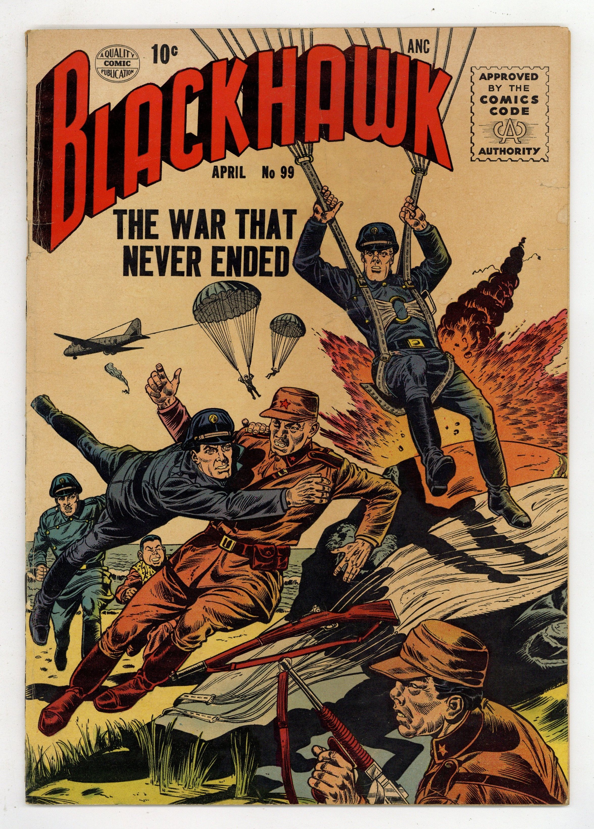 Cover by Dick Dillin and Chuck Cuidera. Stories by Joe Millard, Robert Bernstein and unknown. Art by Dick Dillin, Chuck Cuidera and Sam Citron. Featuring Blackhawk in: "The Queen of Blackhawk Island" by Joe Millard, Dick Dillin and Chuck Cuidera; "The War That Never Ended" by Robert Bernstein, Dillin and Cuidera; "The Underground Menace" by Bernstein, Dillin and Cuidera; and 1-page text story "The Perfect Plan"! Plus: Back-up story "Fear and Flight" with art by Sam Citron. 36 Pages, Full Color. Cover price $0.10.