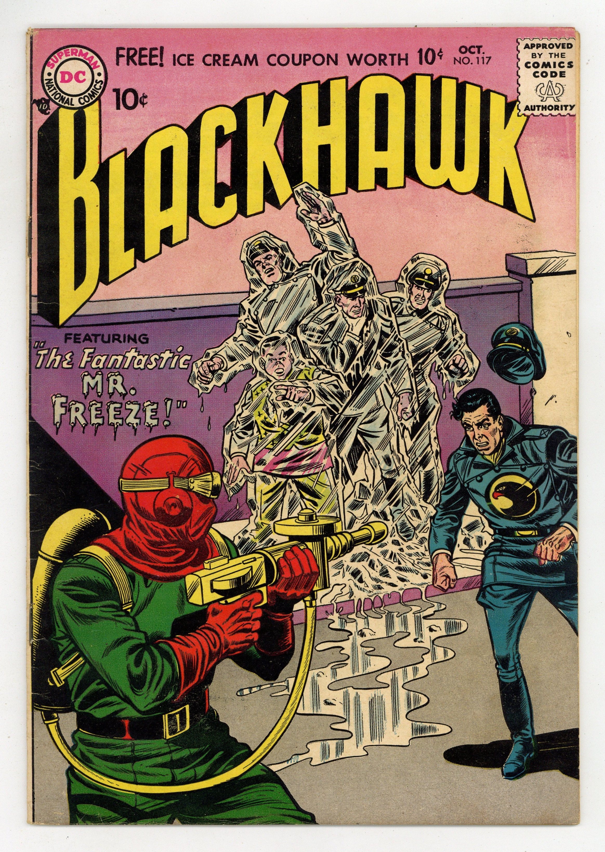 Stories by unknown. Art and Cover by Dick Dillin & Charles Cuidera. Three stories! "The Menace of the Dragon Boat" - Olaf is searching for evidence that his ancestor Gunther Bjornson may have discovered America before Leif Ericson. which involves the Blackhawks with a gang of smugglers. Plus: "The Seven Little Blackhawks" - One by one the Blackhawks receive notes with rhyming warnings, followed by accidents that put them out of commission. And: "The Fantastic Mr. Freeze" - A scientist develops a freeze ray and uses it to commit crimes. Also: 1-page text story "I Was a Human Missile"! 32 pages, full color. Cover price $0.10.