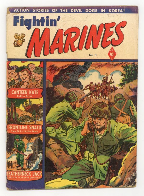 Cover by Matt Baker. Stories and art by Matt Baker and Gene Colan. Charlton's long-running series focused on the miliary exploits of the US Marines throughout the 20th century. The lure of these early issues is the military-comedy series featuring redheaded military mascot Canteen Kate. Kate causes comic chaos when she auditions for an upcoming stage performance for the troops, in a story with art by good-girl art legend Matt Baker. In Korea, Leatherneck Jack is trapped in the target area of the Marine Corps' own rocket attack, in a story with early art by future Marvel legend Gene Colan. Meanwhile, his buddies Monte and Gum travel toward a hidden enemy outpost at Junkyard Junction. Plus two more Colan stories. Cover by Baker. Frontline Private; Leatherneck Jack: Blitz at Junkyard Junction; Canteen Kate: Call to Arms; Front Line Snafu; Disguised for Death!; Enemy Breakthrough. 36 pages, Full Color. Cover price $0.10.