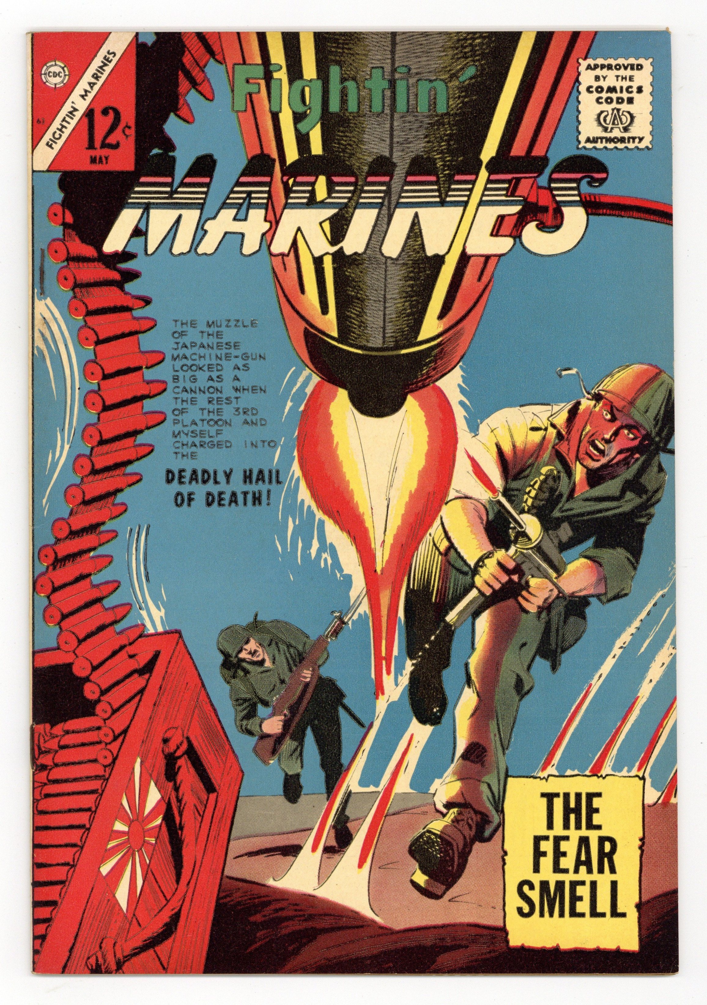 Cover by Dick Giordano. Stories and art by Rocco "Rocke" Mastroserio, Jon D'Agostino, and Bill Molno. Charlton's long-running series focused on the miliary exploits of the US Marines throughout the 20th century. The 1st Marine division is surrounded by enemy forces in Korea, but luckily, they've got air support. Marines attempt to reach the friendly village of San Gabriel before Axis forces can administer reprisals. Marines have no other means of attacking an Axis machinegun nest than a frontal assault. Who's in a Jam?; Call From Darkness; The Fear Smell; Senoj to Safety; Frisco Red; The Old Queens; Raiders at Dawn. 32 pages, Full Color. Cover price $0.12.